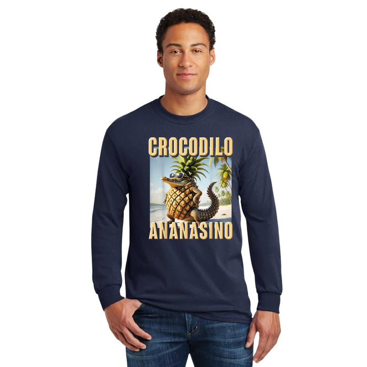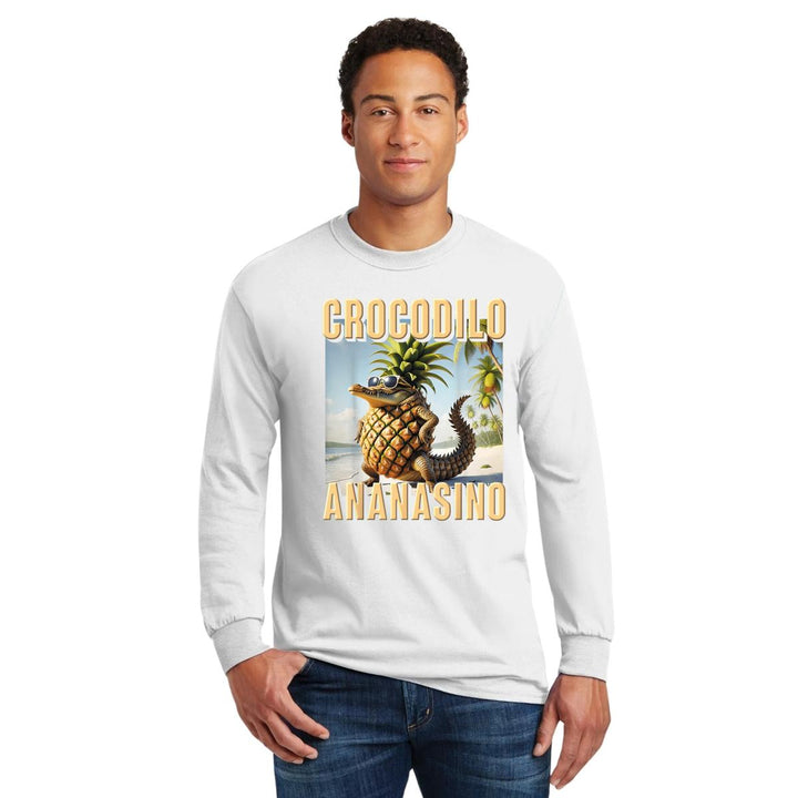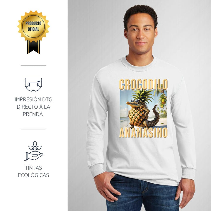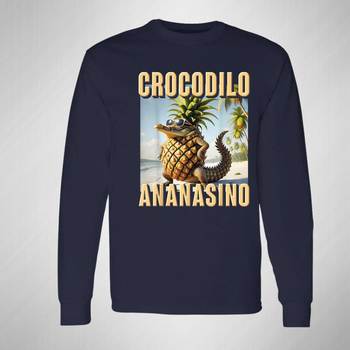 Playera de adulto manga larga, cuello redondo para hombre nueva, diseño Brainrot Crocodilo Ananasino original impreso con tecnología DTG (directo a la prenda) tacto cero, uso casual o deportiva, 100% algodón chifón pre encogido, estructura tubular sin costuras laterales. Colores de camiseta para caballero: Negro, Blanco, Azul Marino.