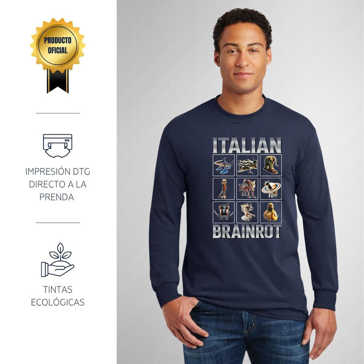 Playera de adulto manga larga, cuello redondo para hombre nueva, diseño Brainrot Italianos original impreso con tecnología DTG (directo a la prenda) tacto cero, uso casual o deportiva, 100% algodón chifón pre encogido, estructura tubular sin costuras laterales. Colores de camiseta para caballero: Negro, Azul Marino.