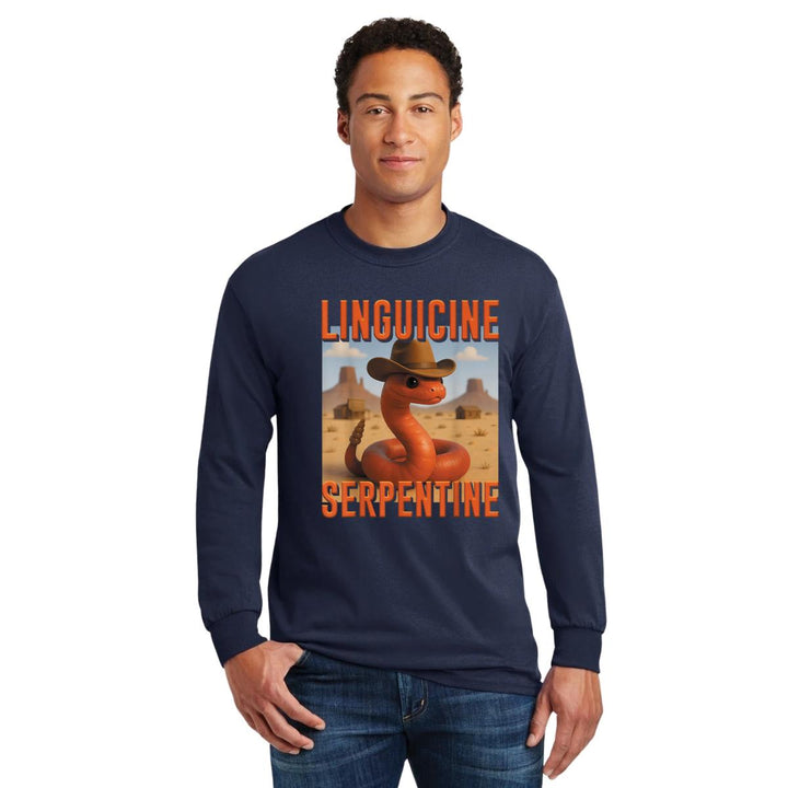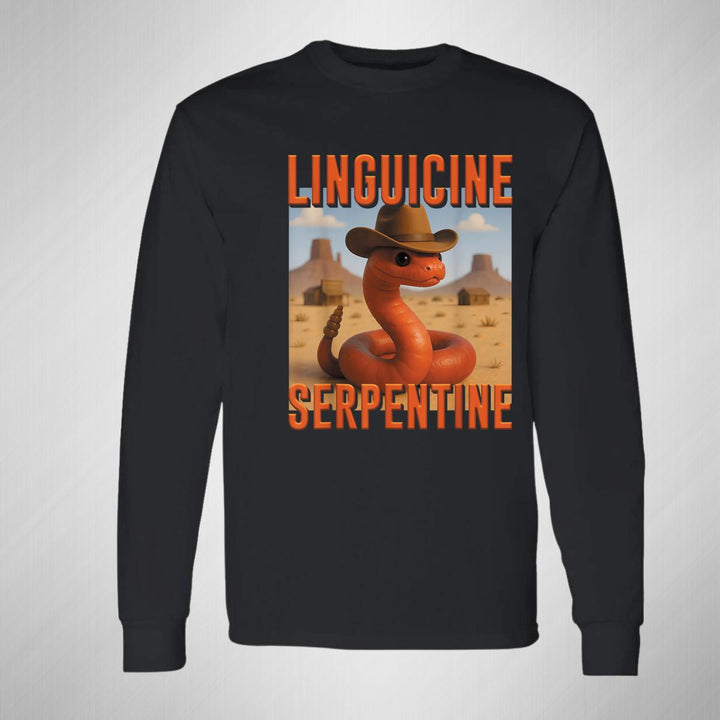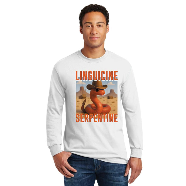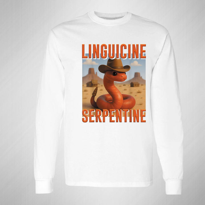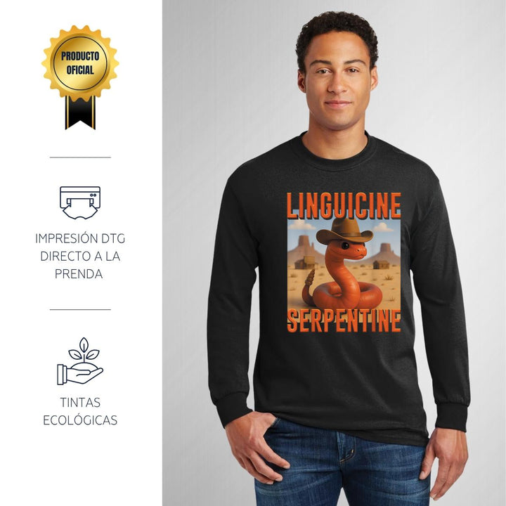 Playera de adulto manga larga, cuello redondo para hombre nueva, diseño Brainrot Linguicine Serpentine original impreso con tecnología DTG (directo a la prenda) tacto cero, uso casual o deportiva, 100% algodón chifón pre encogido, estructura tubular sin costuras laterales. Colores de camiseta para caballero: Negro, Blanco, Azul Marino.
