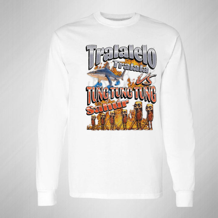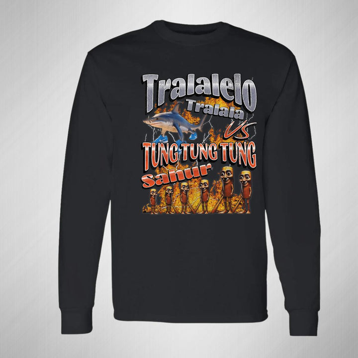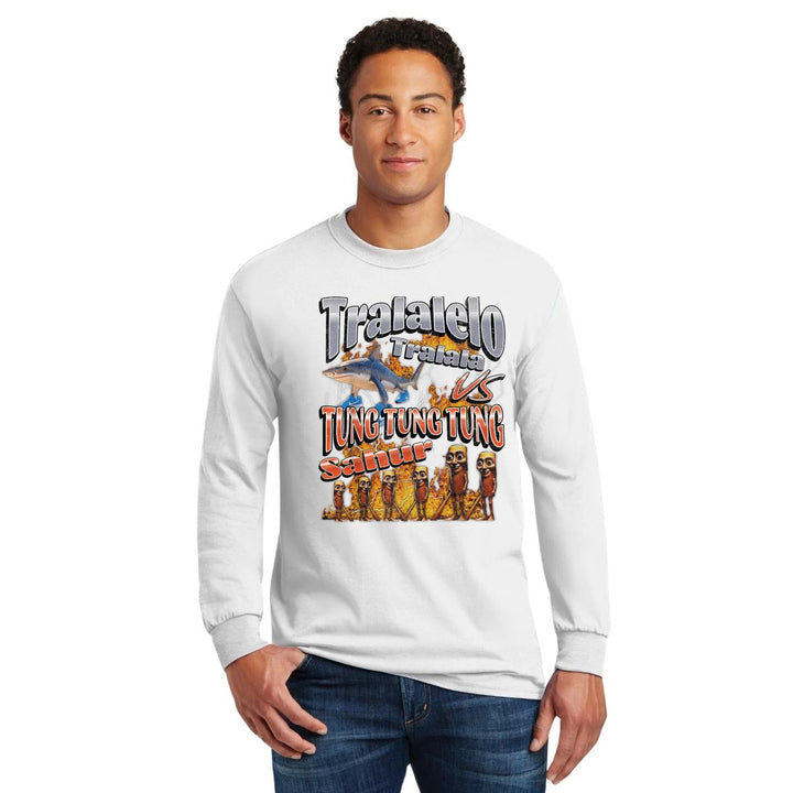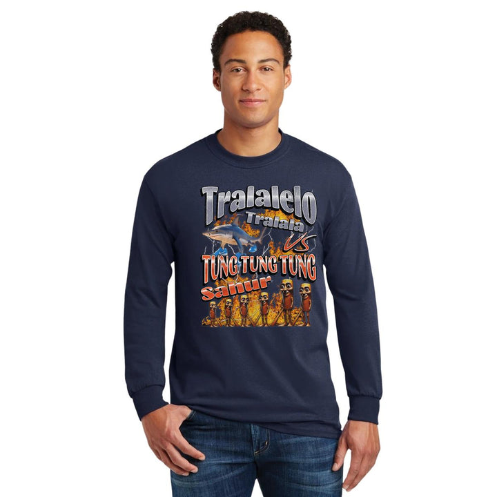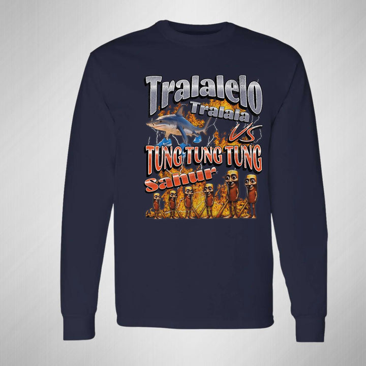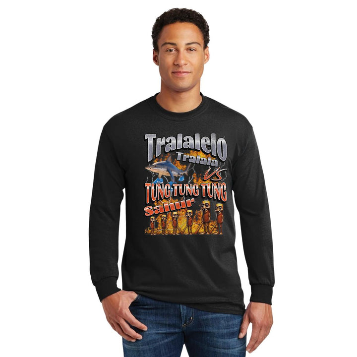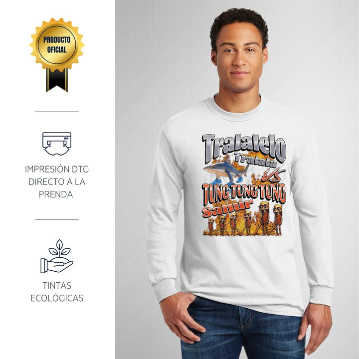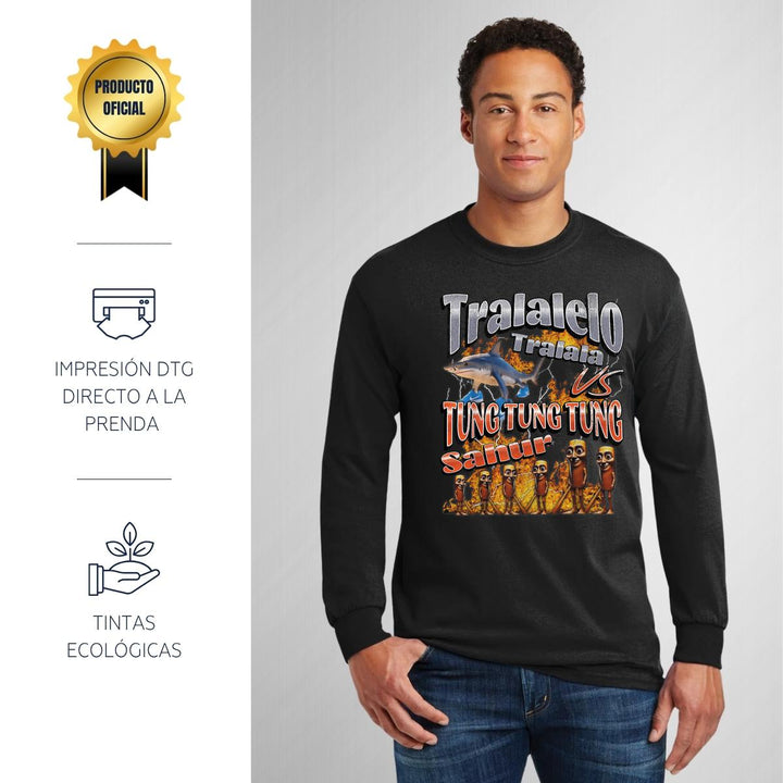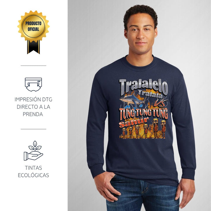 Playera de adulto manga larga, cuello redondo para hombre nueva, diseño Brainrot Tralala Tung Tung original impreso con tecnología DTG (directo a la prenda) tacto cero, uso casual o deportiva, 100% algodón chifón pre encogido, estructura tubular sin costuras laterales. Colores de camiseta para caballero: Negro, Blanco, Azul Marino.