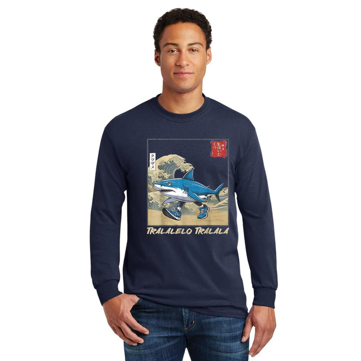 Playera de adulto manga larga, cuello redondo para hombre nueva, diseño Brainrot Tralalero Tralala original impreso con tecnología DTG (directo a la prenda) tacto cero, uso casual o deportiva, 100% algodón chifón pre encogido, estructura tubular sin costuras laterales. Colores de camiseta para caballero: Negro, Blanco, Azul Marino.