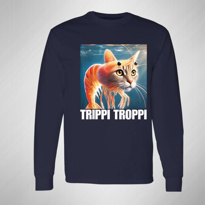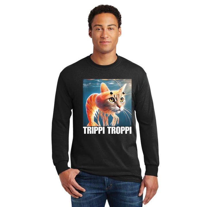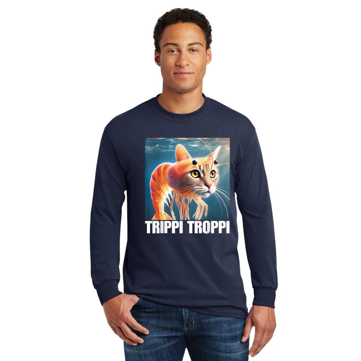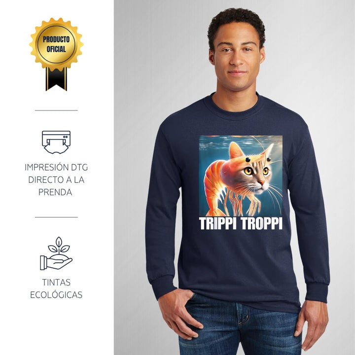 Playera de adulto manga larga, cuello redondo para hombre nueva, diseño Brainrot Trippi Troppi original impreso con tecnología DTG (directo a la prenda) tacto cero, uso casual o deportiva, 100% algodón chifón pre encogido, estructura tubular sin costuras laterales. Colores de camiseta para caballero: Negro, Azul Marino.
