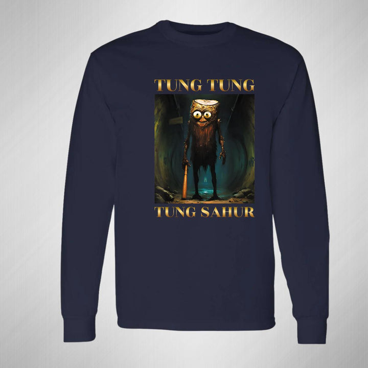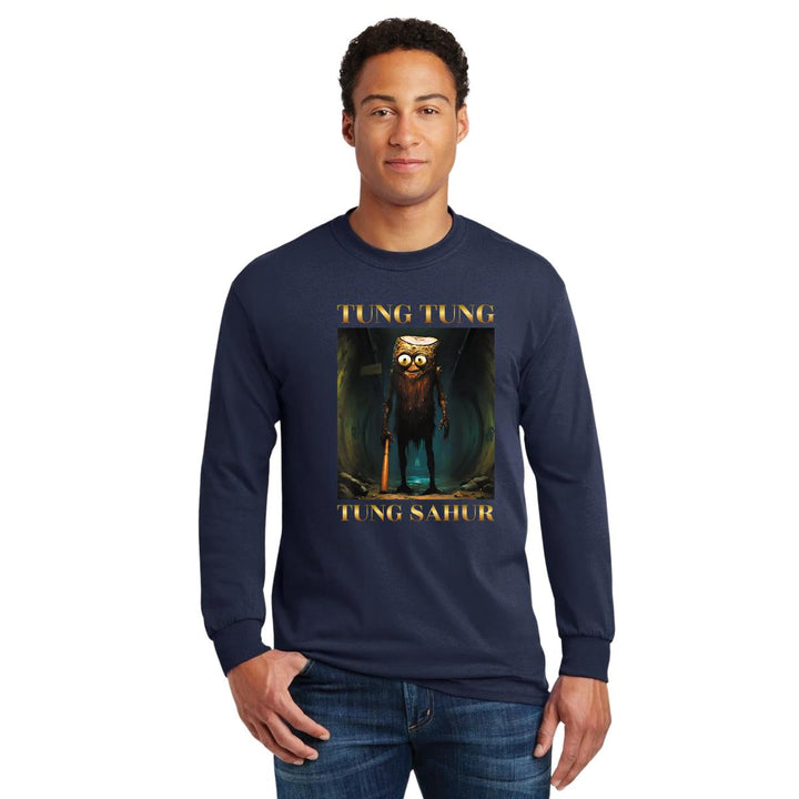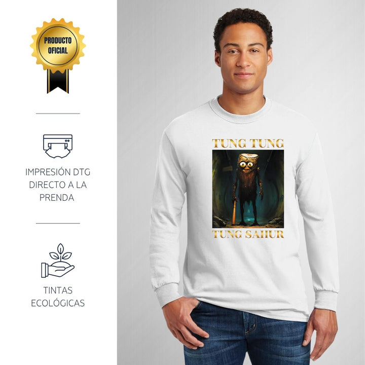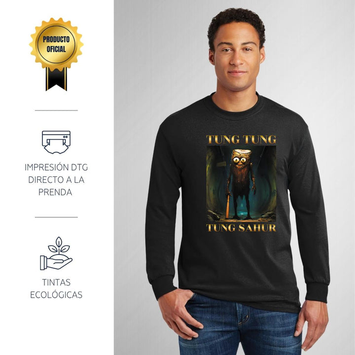 Playera de adulto manga larga, cuello redondo para hombre nueva, diseño Brainrot Tung Tung Tung Sahur original impreso con tecnología DTG (directo a la prenda) tacto cero, uso casual o deportiva, 100% algodón chifón pre encogido, estructura tubular sin costuras laterales. Colores de camiseta para caballero: Negro, Blanco, Azul Marino.