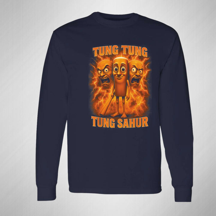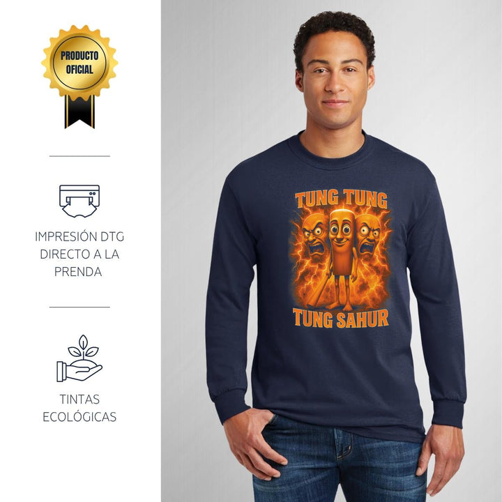 Playera de adulto manga larga, cuello redondo para hombre nueva, diseño Brainrot Tung Tung Tung Sahur original impreso con tecnología DTG (directo a la prenda) tacto cero, uso casual o deportiva, 100% algodón chifón pre encogido, estructura tubular sin costuras laterales. Colores de camiseta para caballero: Negro, Blanco, Azul Marino.