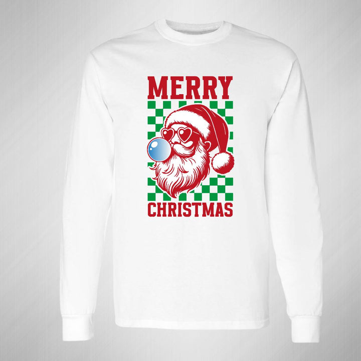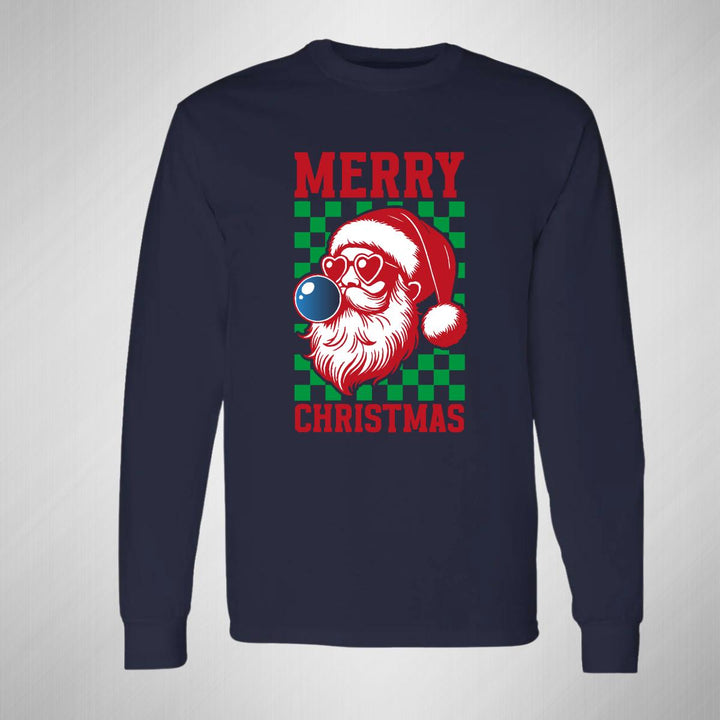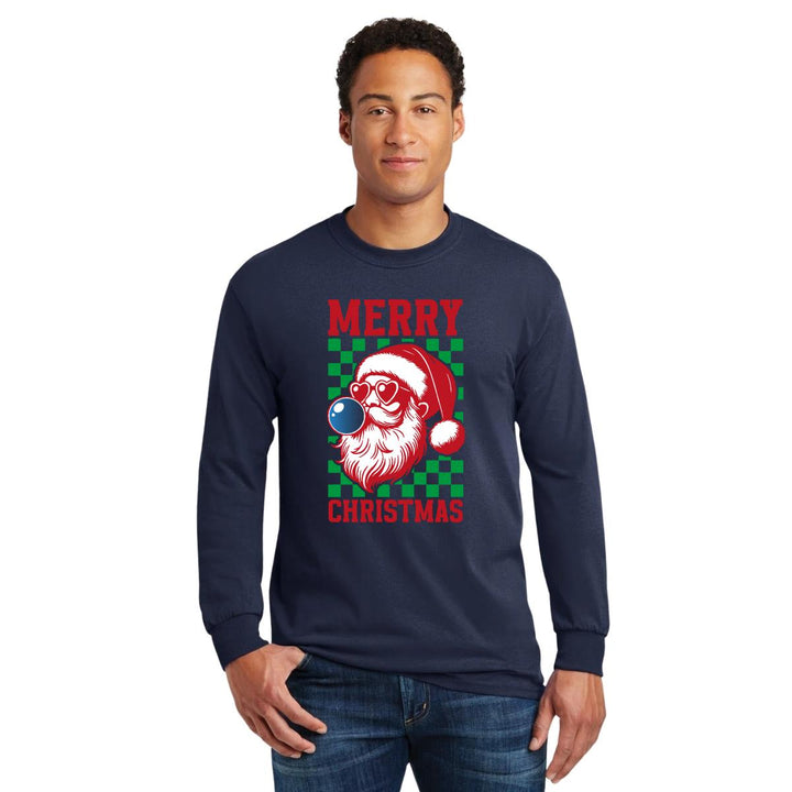 Playera de adulto manga larga, cuello redondo para hombre nueva, diseño Merry Christmas original impreso con tecnología DTG (directo a la prenda) tacto cero, uso casual o deportiva, 100% algodón chifón pre encogido, estructura tubular sin costuras laterales. Colores de camiseta para caballero: Negro, Blanco, Azul Marino.
