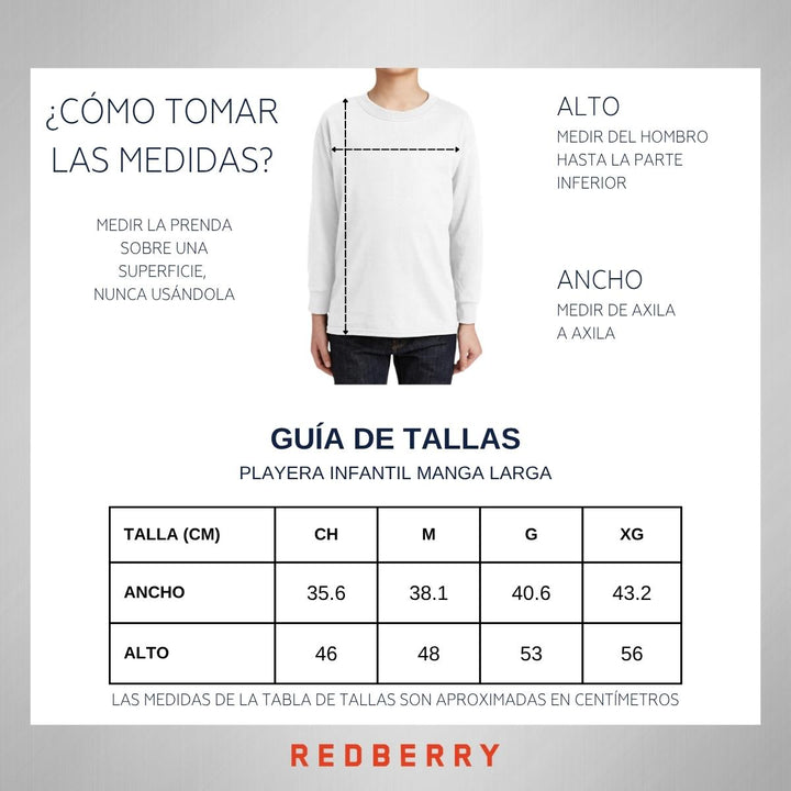 Playera infantil manga larga, cuello redondo para niño o niña nueva, diseño original impreso con tecnología DTG (directo a la prenda) tacto cero, uso casual o deportiva, 100% algodón, estructura tubular sin costuras laterales. Colores de camiseta: Negro, Blanco, Azul Marino.