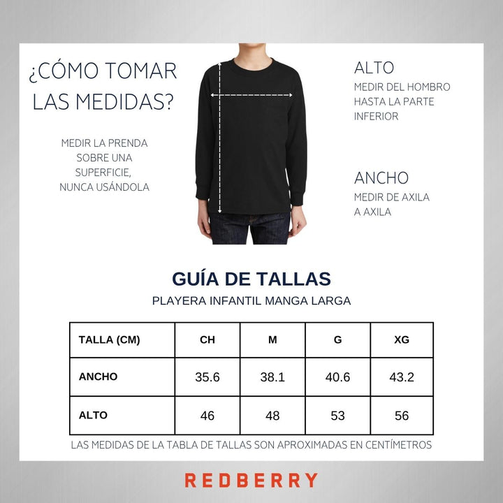 Playera infantil manga larga, cuello redondo para niño o niña nueva, diseño original impreso con tecnología DTG (directo a la prenda) tacto cero, uso casual o deportiva, 100% algodón, estructura tubular sin costuras laterales. Colores de camiseta: Negro, Blanco, Azul Marino.