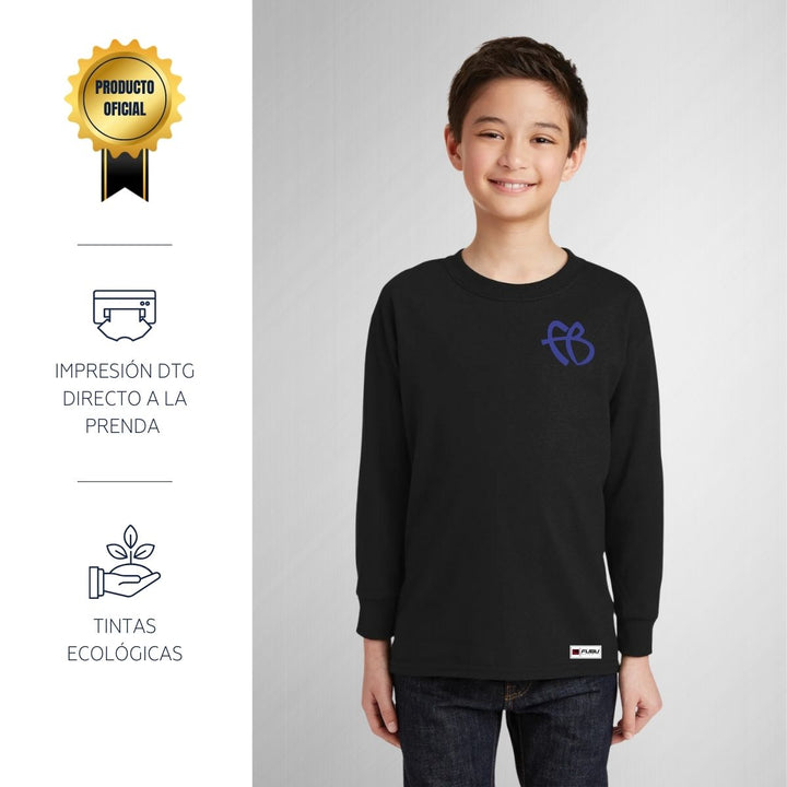 Playera infantil manga larga, cuello redondo para niño o niña nueva, diseño original impreso con tecnología DTG (directo a la prenda) tacto cero, uso casual o deportiva, 100% algodón, estructura tubular sin costuras laterales. Colores de camiseta: Negro, Blanco, Azul Marino.