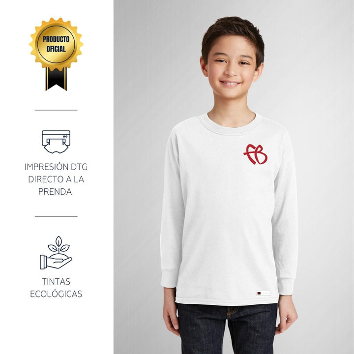 Playera infantil manga larga, cuello redondo para niño o niña nueva, diseño original impreso con tecnología DTG (directo a la prenda) tacto cero, uso casual o deportiva, 100% algodón, estructura tubular sin costuras laterales. Colores de camiseta: Negro, Blanco, Azul Marino.