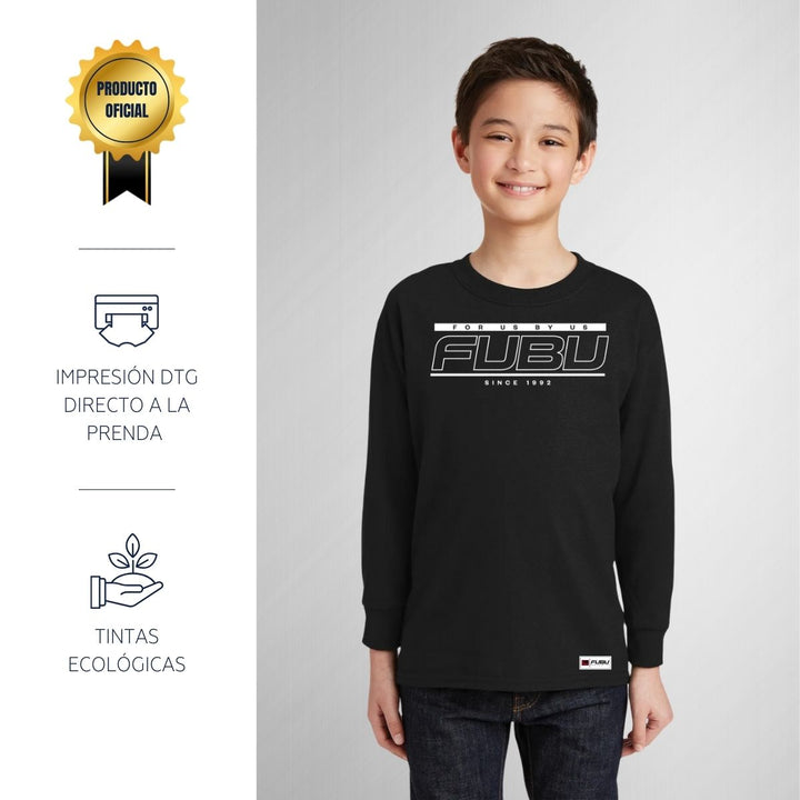 Playera infantil manga larga, cuello redondo para niño o niña nueva, diseño original impreso con tecnología DTG (directo a la prenda) tacto cero, uso casual o deportiva, 100% algodón, estructura tubular sin costuras laterales. Colores de camiseta: Negro, Blanco, Azul Marino.