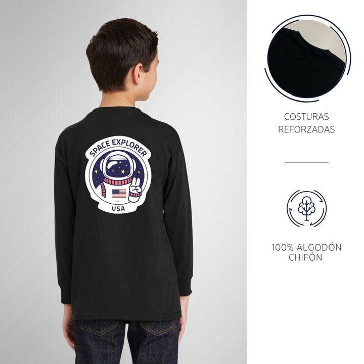 Playera infantil manga larga, cuello redondo para niño o niña nueva, diseño original impreso con tecnología DTG (directo a la prenda) tacto cero, uso casual o deportiva, 100% algodón, estructura tubular sin costuras laterales. Colores de camiseta: Negro, Blanco.