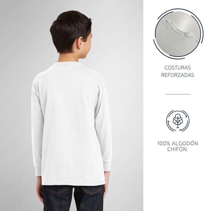 Playera infantil manga larga, cuello redondo para niño o niña nueva, diseño original impreso con tecnología DTG (directo a la prenda) tacto cero, uso casual o deportiva, 100% algodón, estructura tubular sin costuras laterales. Colores de camiseta: Blanco.