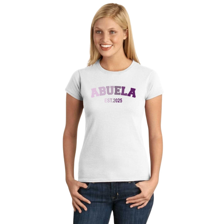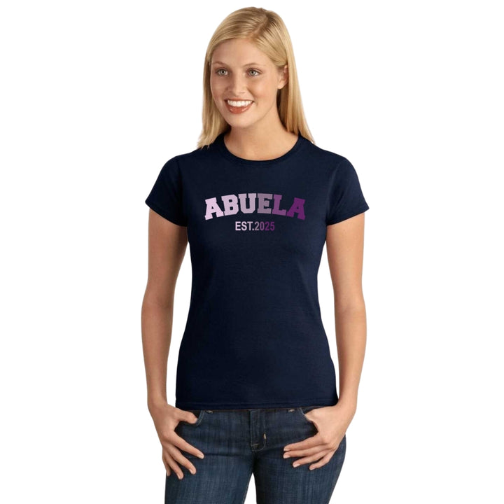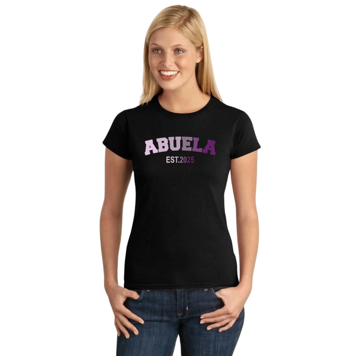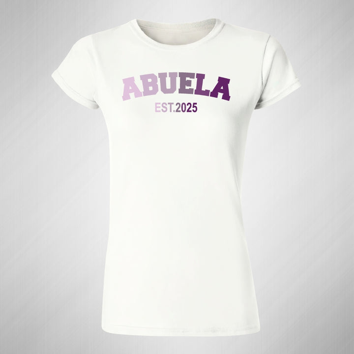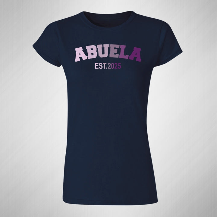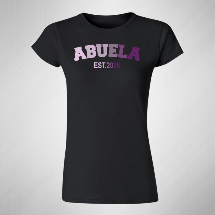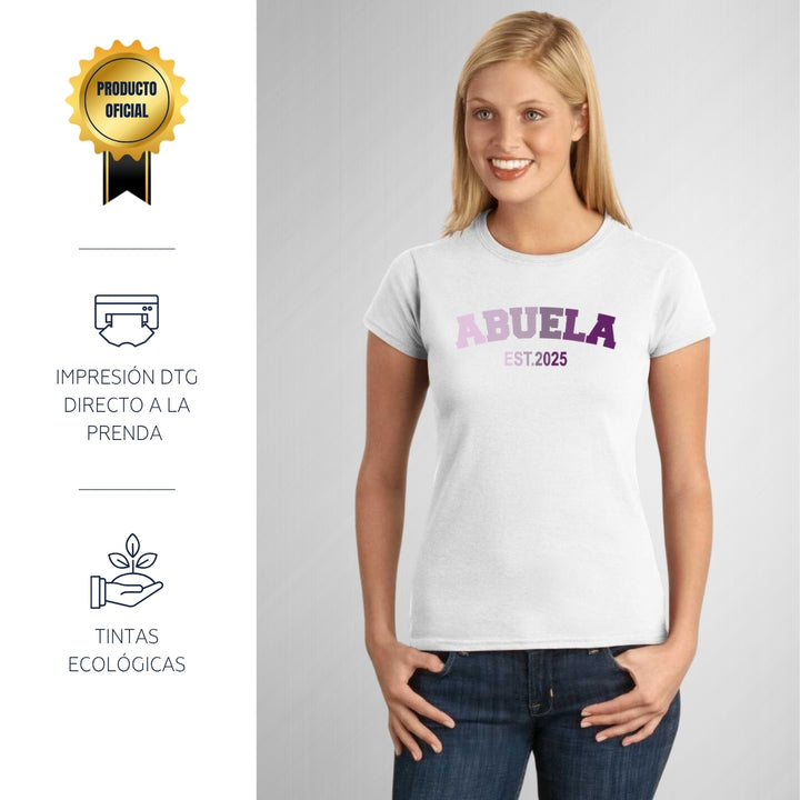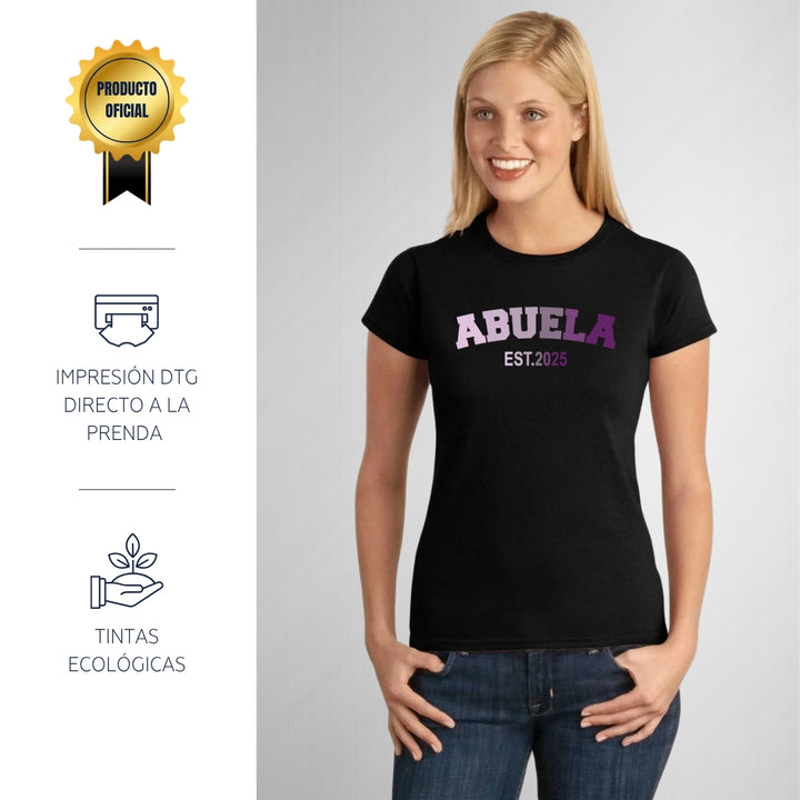 Playera de adulto manga corta, cuello redondo para mujer nueva, diseño Abuela Est original impreso con tecnología DTG (directo a la prenda) tacto cero, uso casual o deportiva, 100% algodón peinado, ajuste semi entallado con costuras laterales. Colores de camiseta para dama: Negro, Blanco, Azul Marino, Gris.