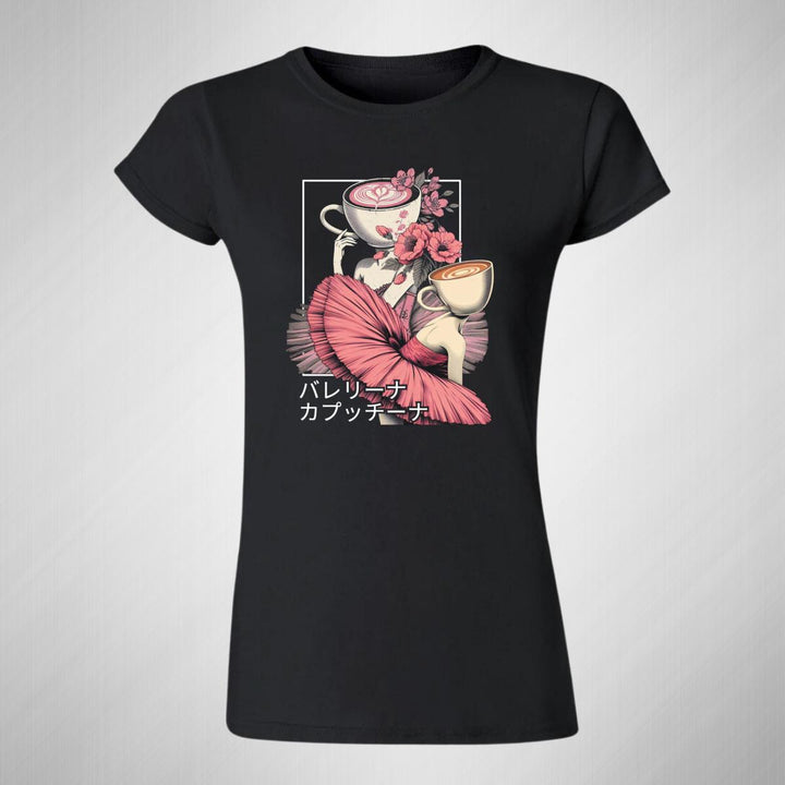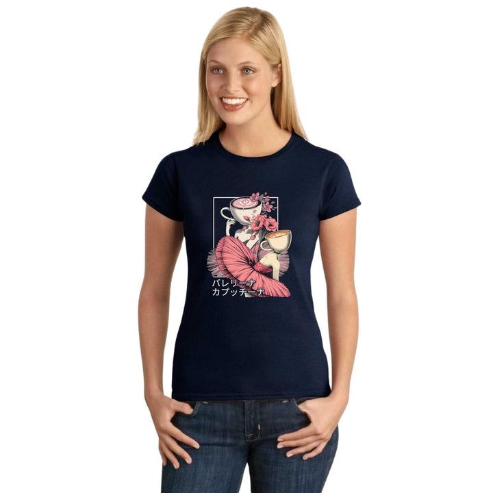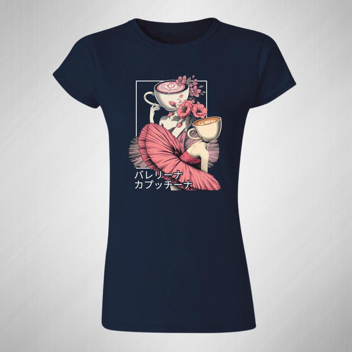Playera de adulto manga corta, cuello redondo para mujer nueva, diseño Brainrot Ballerina Capuchina original impreso con tecnología DTG (directo a la prenda) tacto cero, uso casual o deportiva, 100% algodón peinado, ajuste semi entallado con costuras laterales. Colores de camiseta para dama: Negro, Azul Marino.