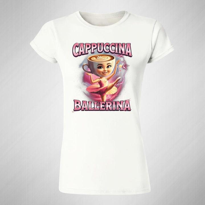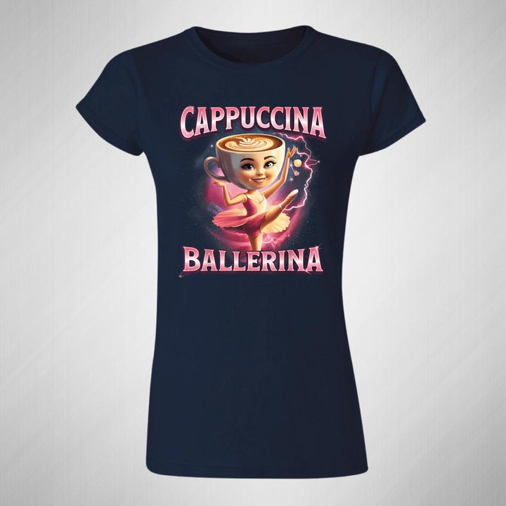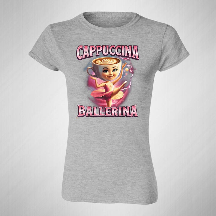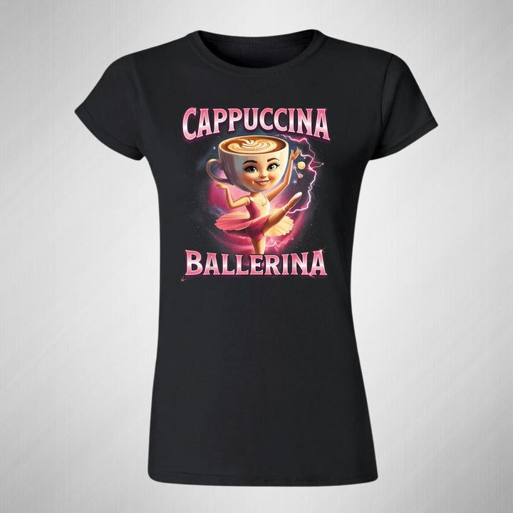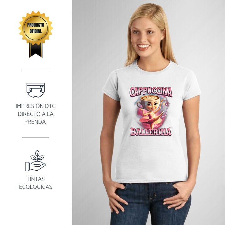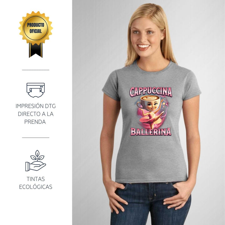 Playera de adulto manga corta, cuello redondo para mujer nueva, diseño Brainrot Ballerina Capuchina original impreso con tecnología DTG (directo a la prenda) tacto cero, uso casual o deportiva, 100% algodón peinado, ajuste semi entallado con costuras laterales. Colores de camiseta para dama: Negro, Blanco, Azul Marino, Gris.