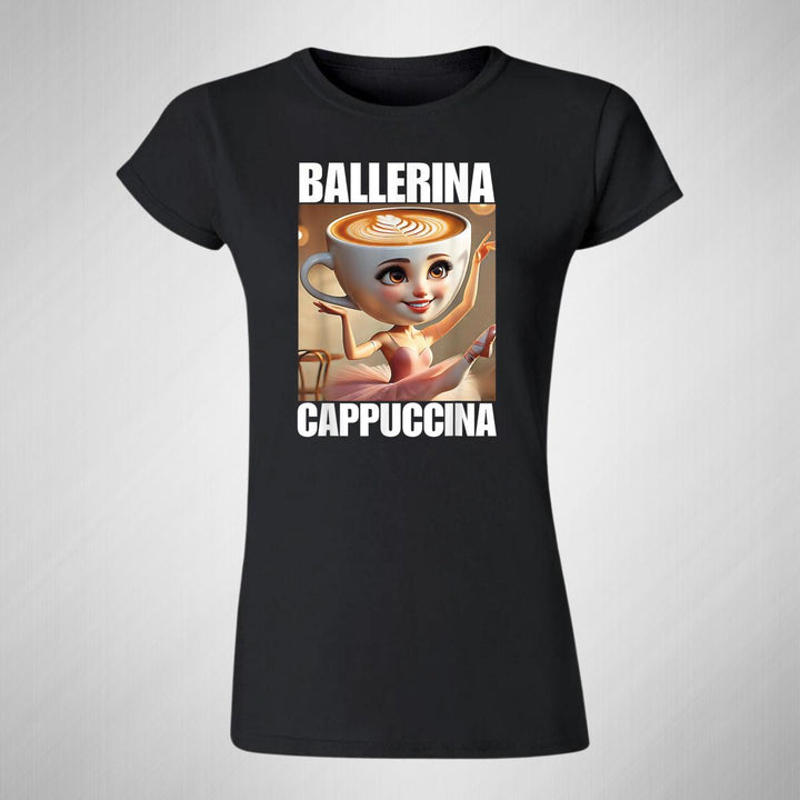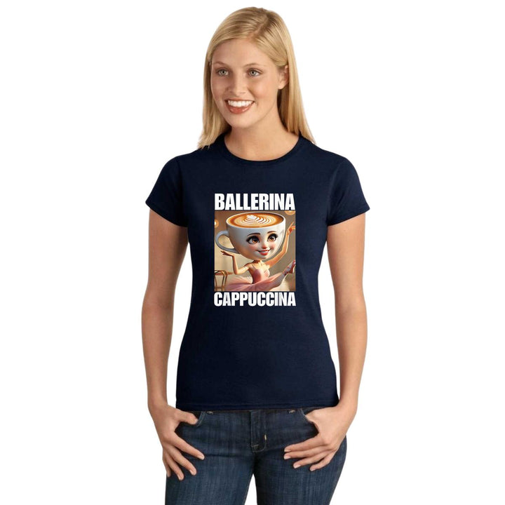 Playera de adulto manga corta, cuello redondo para mujer nueva, diseño Brainrot Ballerina Capuchina original impreso con tecnología DTG (directo a la prenda) tacto cero, uso casual o deportiva, 100% algodón peinado, ajuste semi entallado con costuras laterales. Colores de camiseta para dama: Negro, Azul Marino.