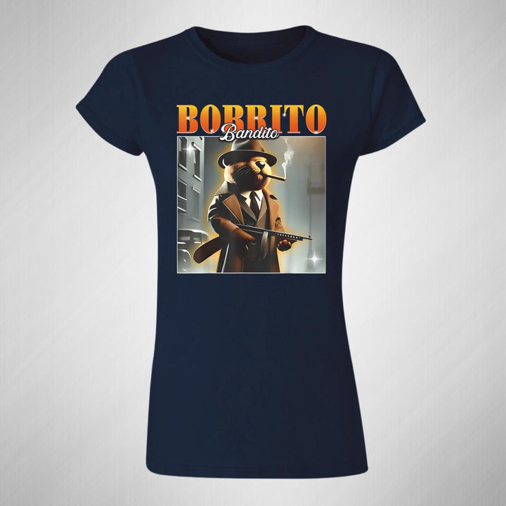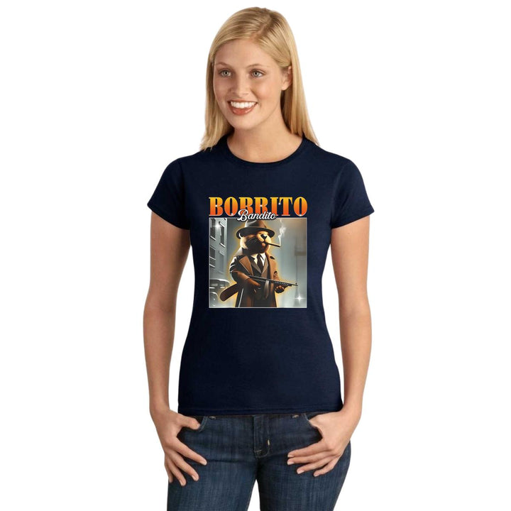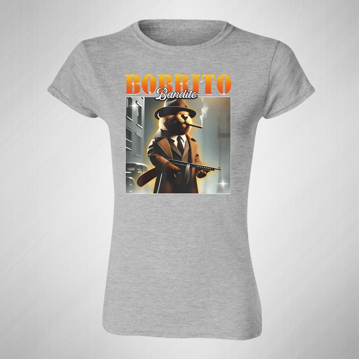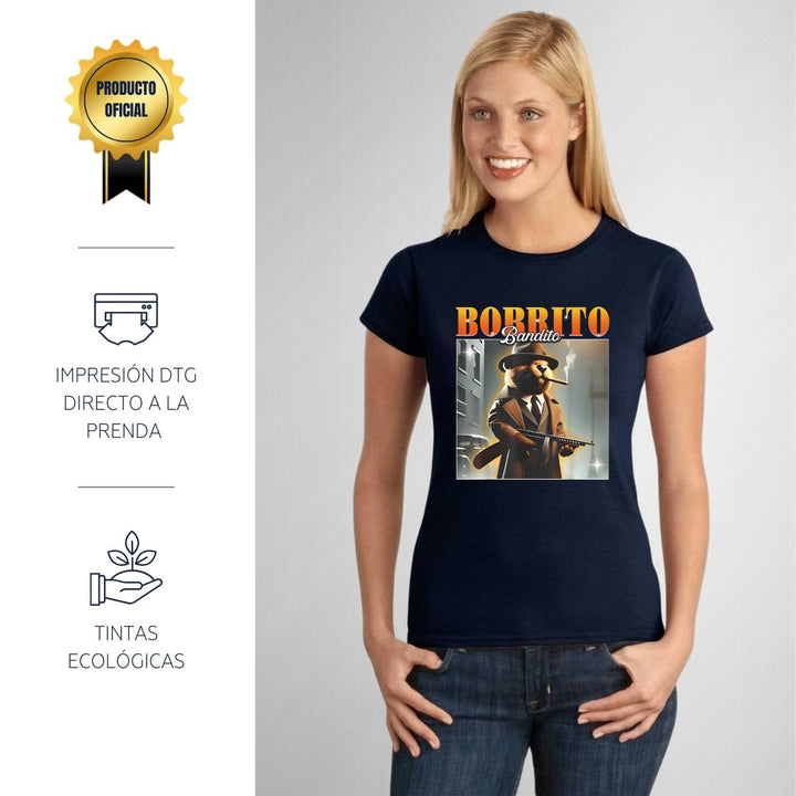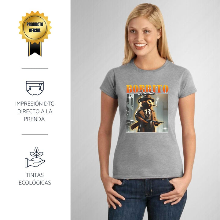Playera de adulto manga corta, cuello redondo para mujer nueva, diseño Brainrot Bobrito Bandito original impreso con tecnología DTG (directo a la prenda) tacto cero, uso casual o deportiva, 100% algodón peinado, ajuste semi entallado con costuras laterales. Colores de camiseta para dama: Negro, Blanco, Azul Marino, Gris.