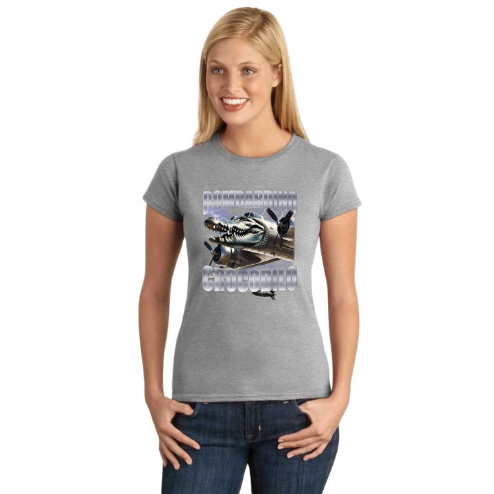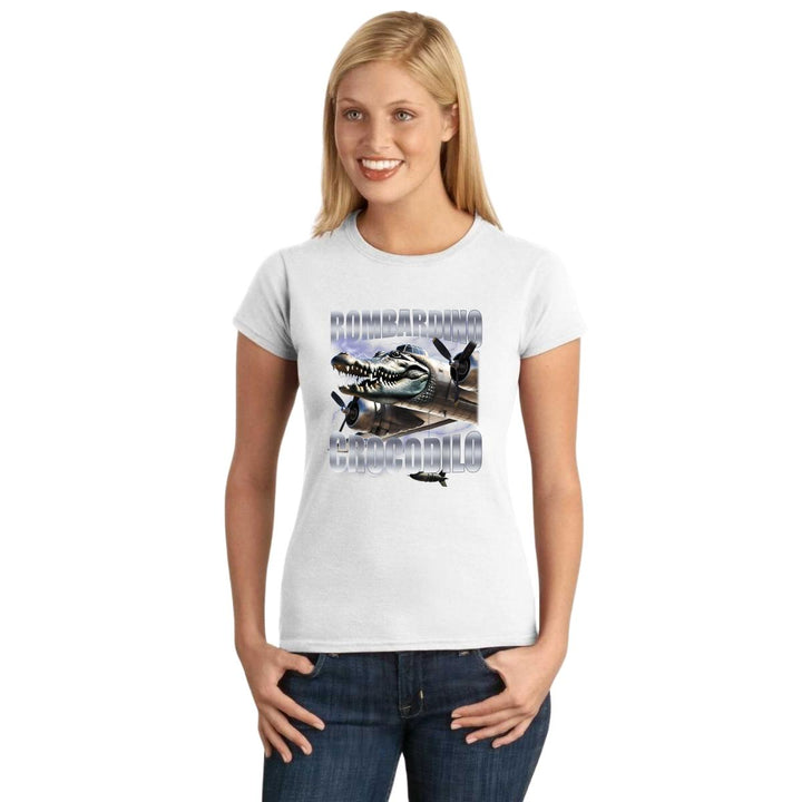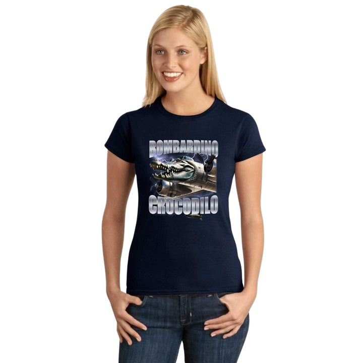 Playera de adulto manga corta, cuello redondo para mujer nueva, diseño Brainrot Bombardino Cocodrilo original impreso con tecnología DTG (directo a la prenda) tacto cero, uso casual o deportiva, 100% algodón peinado, ajuste semi entallado con costuras laterales. Colores de camiseta para dama: Negro, Blanco, Azul Marino, Gris.