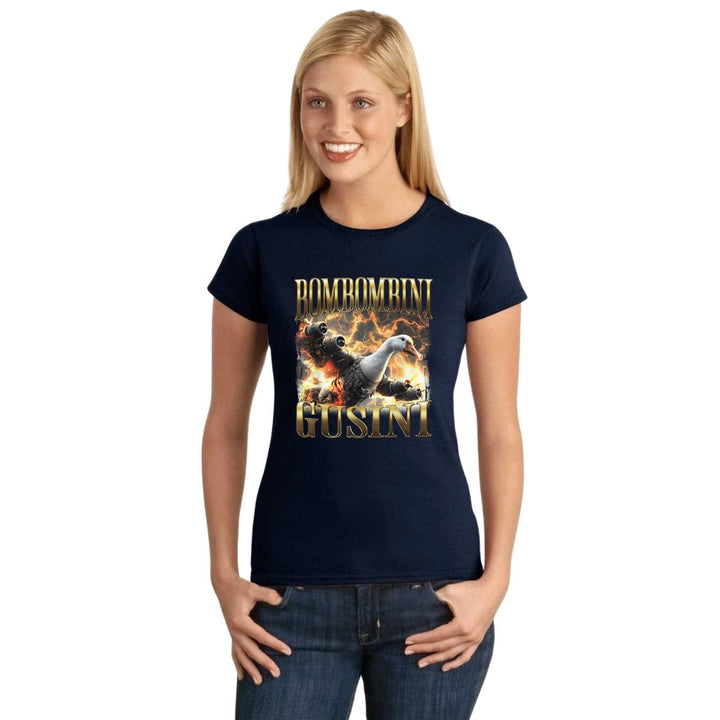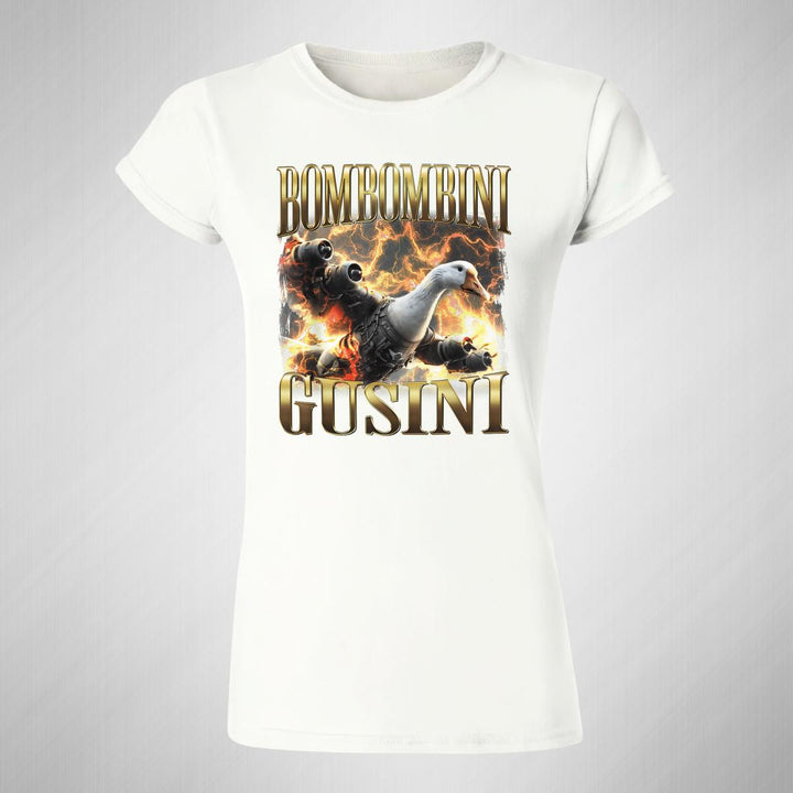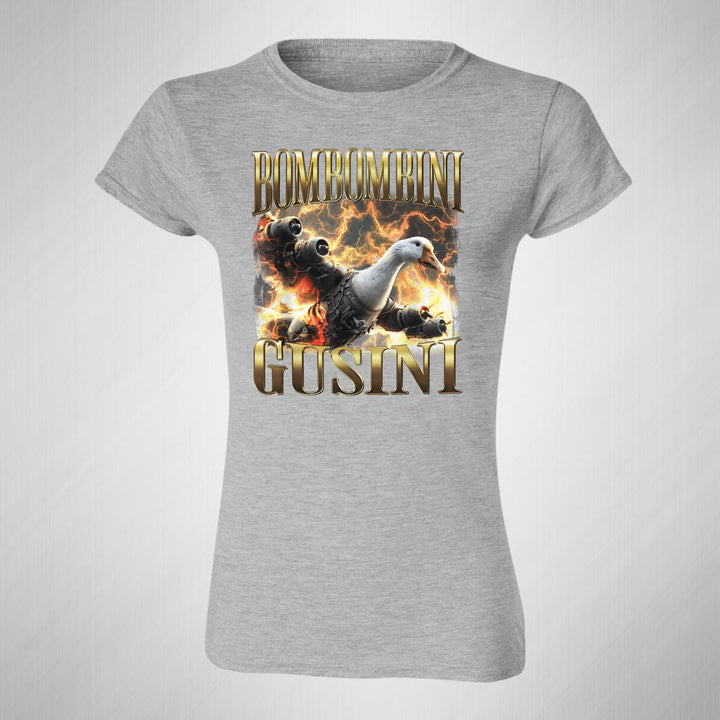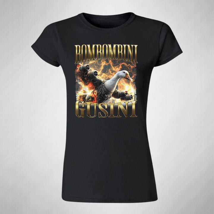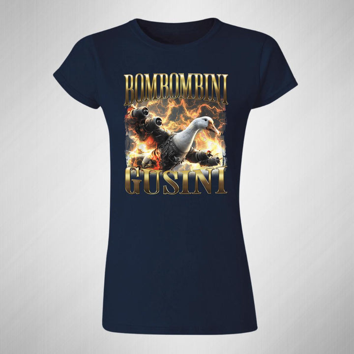 Playera de adulto manga corta, cuello redondo para mujer nueva, diseño Brainrot Bombombini Gusini original impreso con tecnología DTG (directo a la prenda) tacto cero, uso casual o deportiva, 100% algodón peinado, ajuste semi entallado con costuras laterales. Colores de camiseta para dama: Negro, Blanco, Azul Marino, Gris.