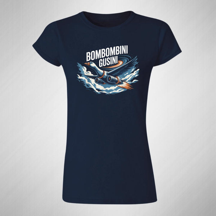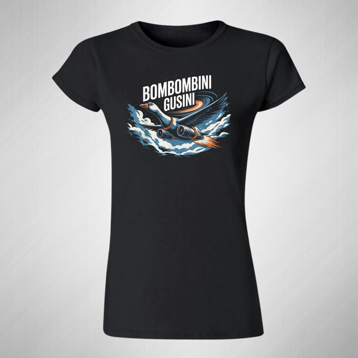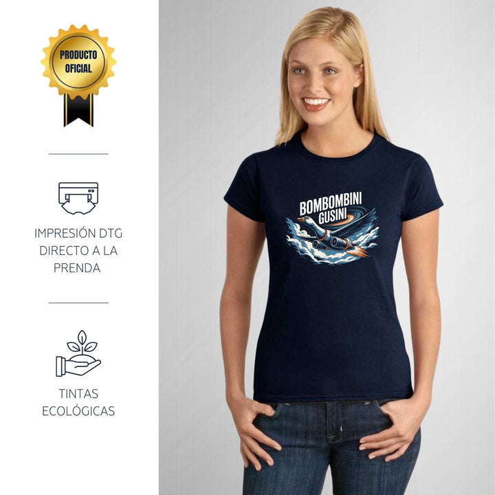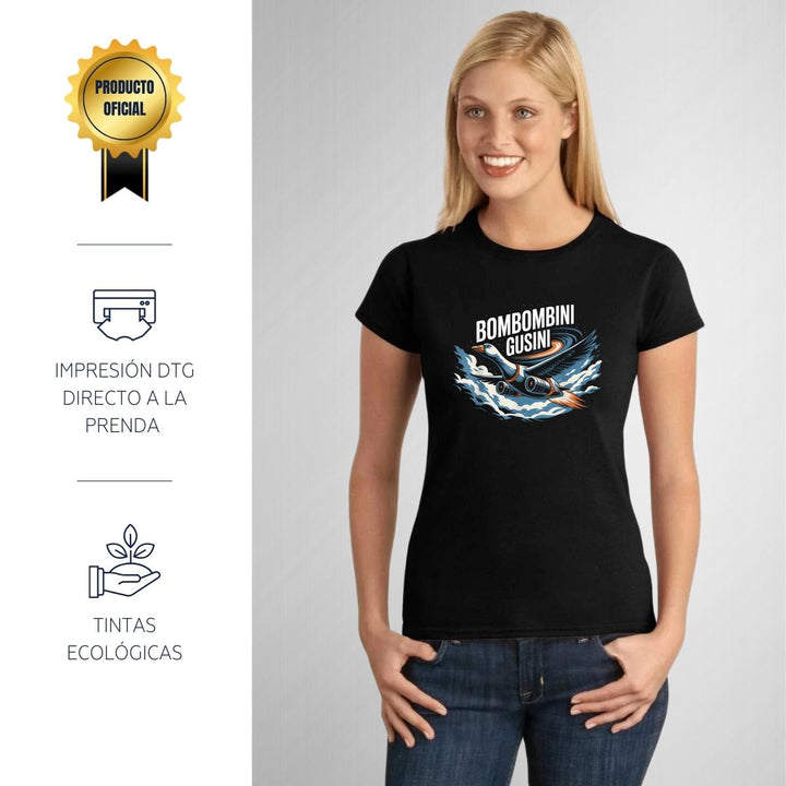 Playera de adulto manga corta, cuello redondo para mujer nueva, diseño Brainrot Bombombini Gusini original impreso con tecnología DTG (directo a la prenda) tacto cero, uso casual o deportiva, 100% algodón peinado, ajuste semi entallado con costuras laterales. Colores de camiseta para dama: Negro, Blanco, Azul Marino, Gris.