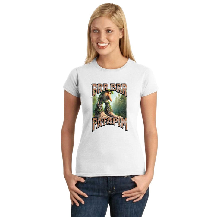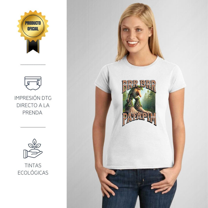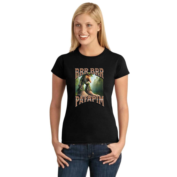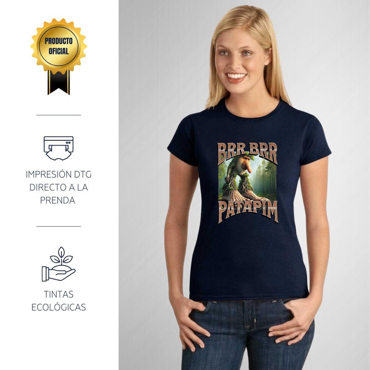 Playera de adulto manga corta, cuello redondo para mujer nueva, diseño Brainrot Brr Brr Patapim original impreso con tecnología DTG (directo a la prenda) tacto cero, uso casual o deportiva, 100% algodón peinado, ajuste semi entallado con costuras laterales. Colores de camiseta para dama: Negro, Blanco, Azul Marino, Gris.