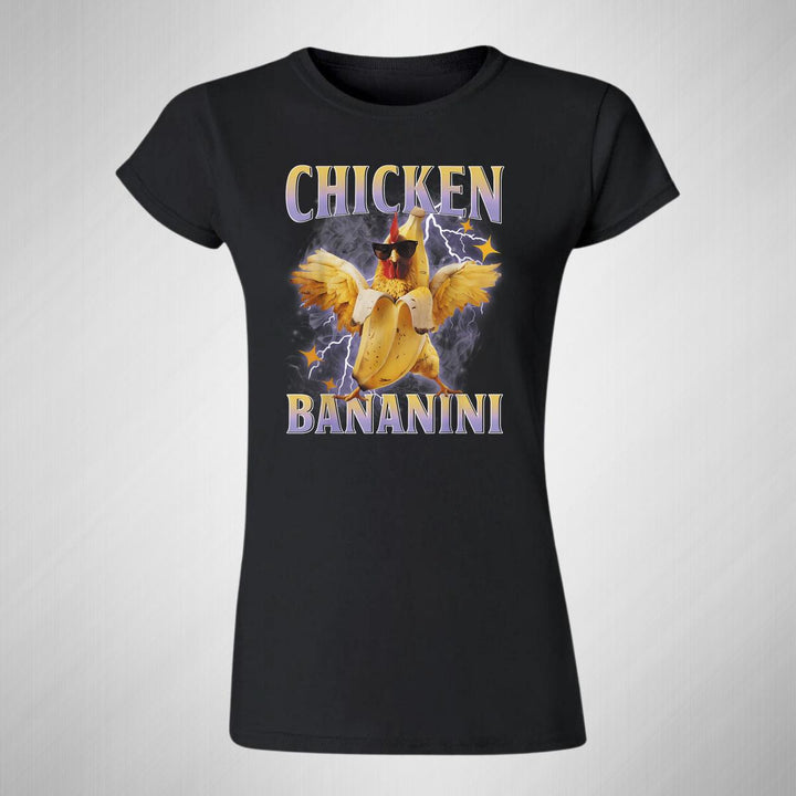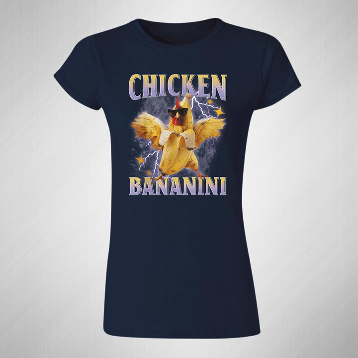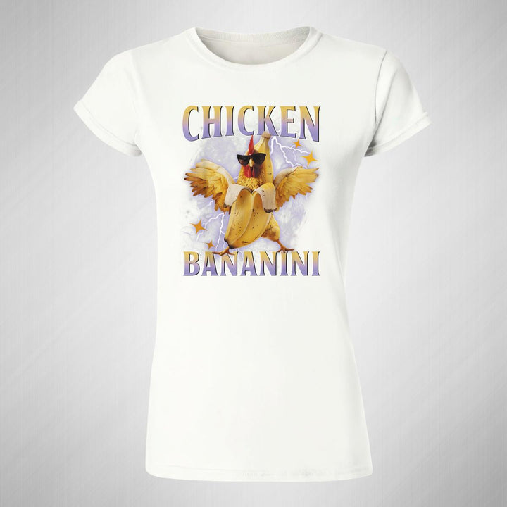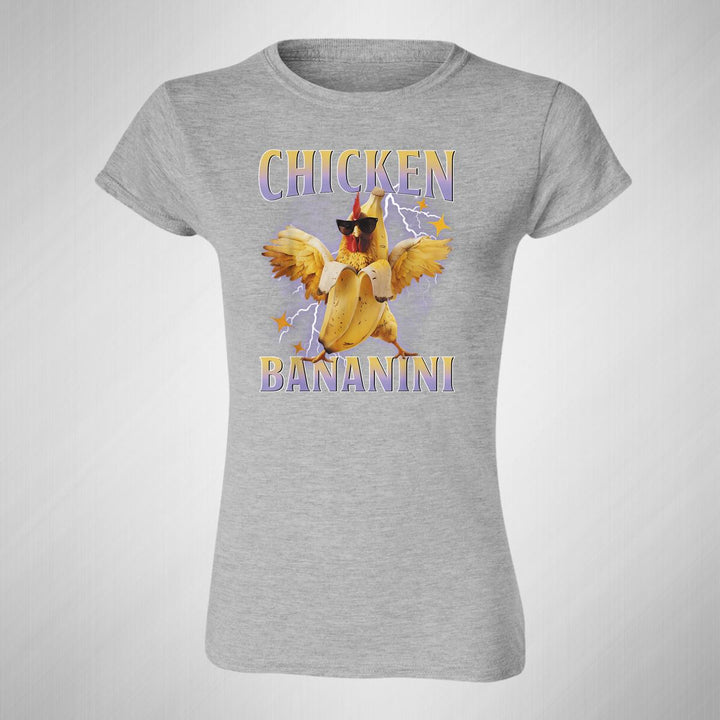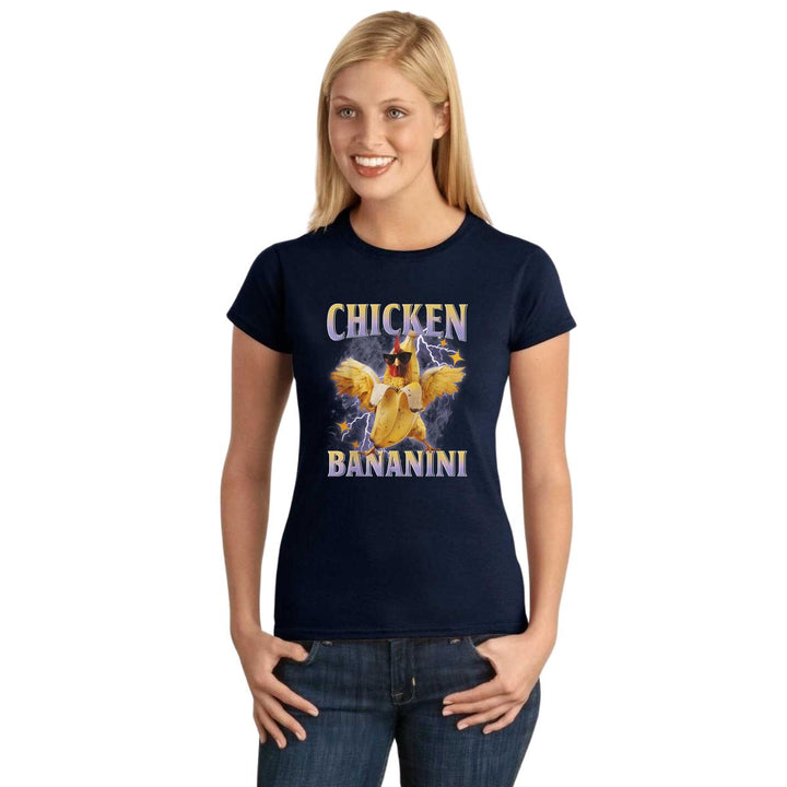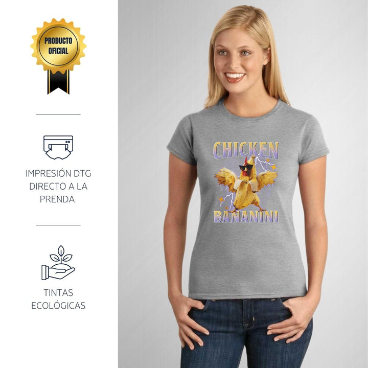 Playera de adulto manga corta, cuello redondo para mujer nueva, diseño Brainrot Chicken Banana original impreso con tecnología DTG (directo a la prenda) tacto cero, uso casual o deportiva, 100% algodón peinado, ajuste semi entallado con costuras laterales. Colores de camiseta para dama: Negro, Blanco, Azul Marino, Gris.