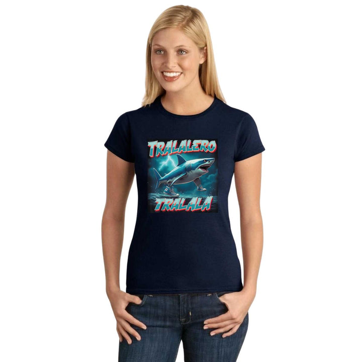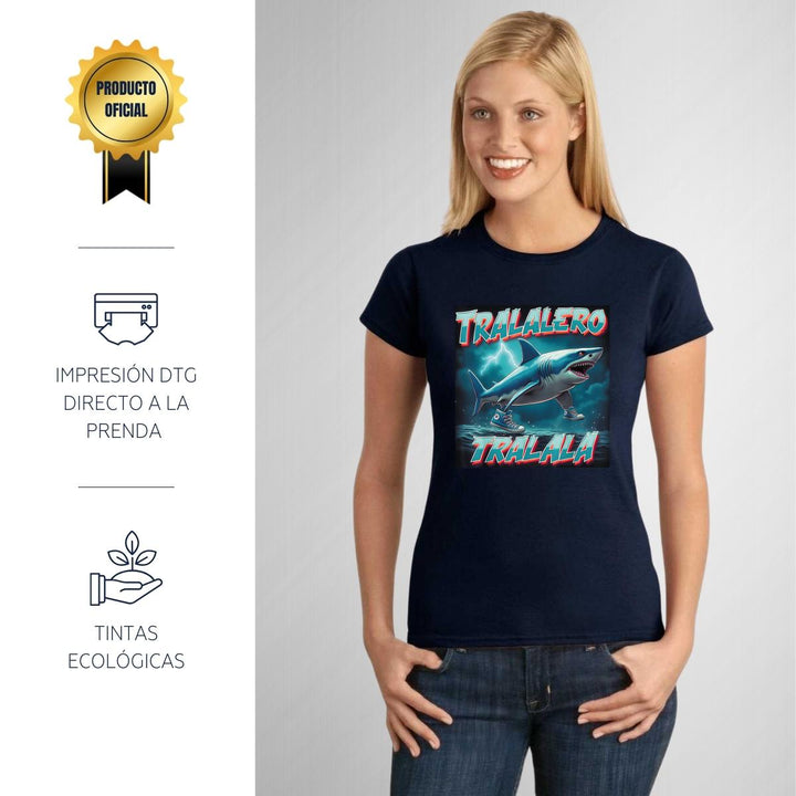 Playera de adulto manga corta, cuello redondo para mujer nueva, diseño Brainrot Tralalero Tralala original impreso con tecnología DTG (directo a la prenda) tacto cero, uso casual o deportiva, 100% algodón peinado, ajuste semi entallado con costuras laterales. Colores de camiseta para dama: Negro, Blanco, Azul Marino, Gris.