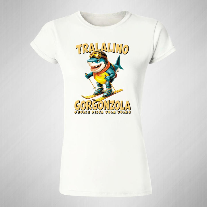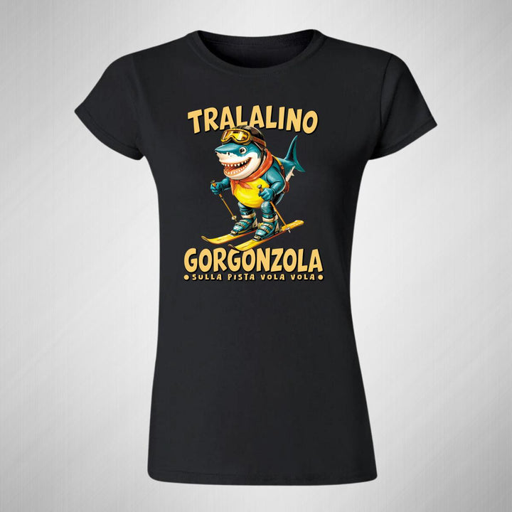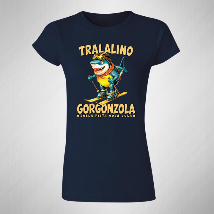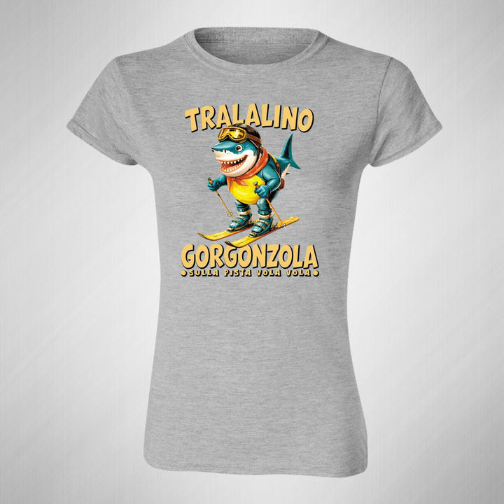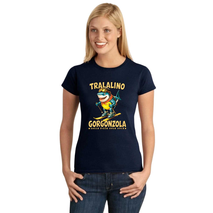 Playera de adulto manga corta, cuello redondo para mujer nueva, diseño Brainrot Tralalino Gorgonzola original impreso con tecnología DTG (directo a la prenda) tacto cero, uso casual o deportiva, 100% algodón peinado, ajuste semi entallado con costuras laterales. Colores de camiseta para dama: Negro, Blanco, Azul Marino, Gris.
