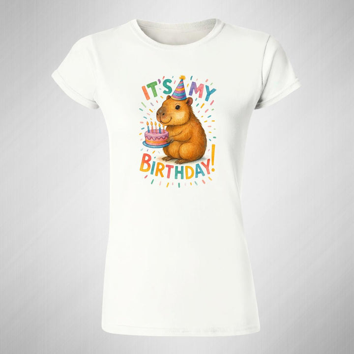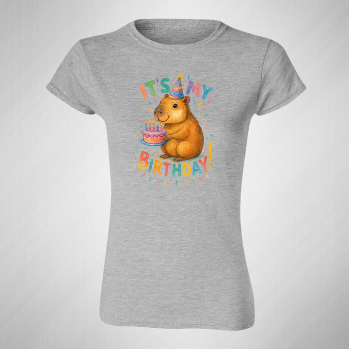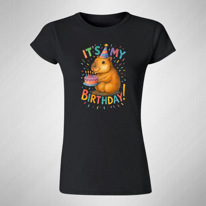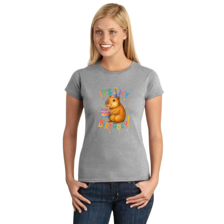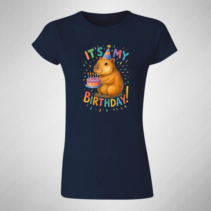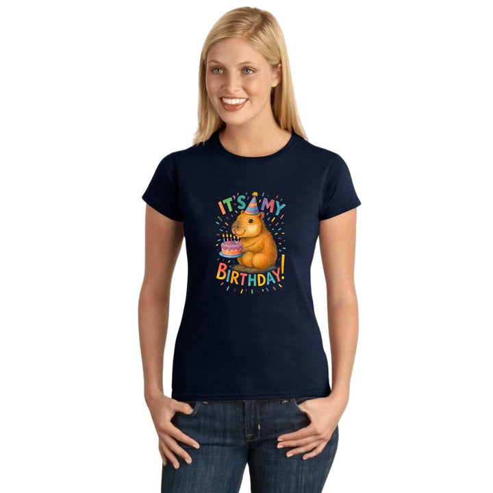 Playera de adulto manga corta, cuello redondo para mujer nueva, diseño Capibara Carpincho Frases original impreso con tecnología DTG (directo a la prenda) tacto cero, uso casual o deportiva, 100% algodón peinado, ajuste semi entallado con costuras laterales. Colores de camiseta para dama: Negro, Blanco, Azul Marino, Gris.