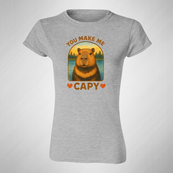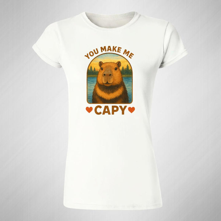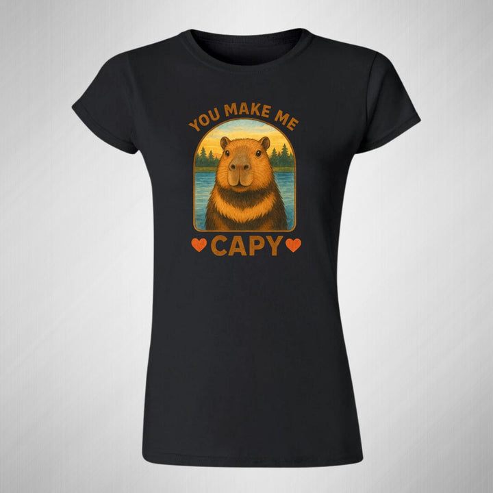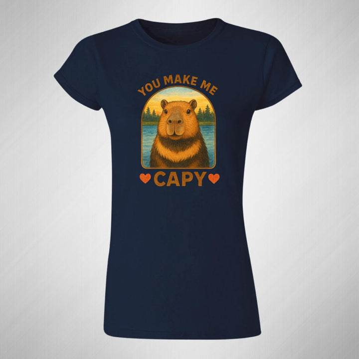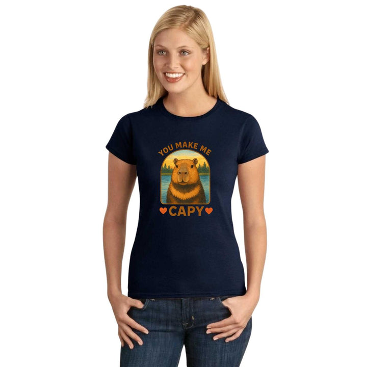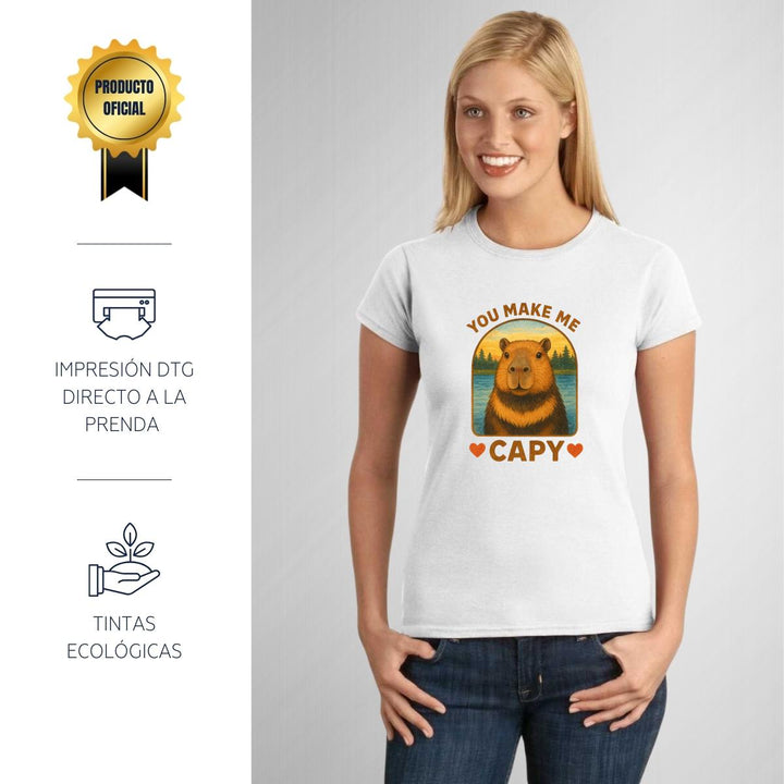 Playera de adulto manga corta, cuello redondo para mujer nueva, diseño Capibara Carpincho Frases original impreso con tecnología DTG (directo a la prenda) tacto cero, uso casual o deportiva, 100% algodón peinado, ajuste semi entallado con costuras laterales. Colores de camiseta para dama: Negro, Blanco, Azul Marino, Gris.