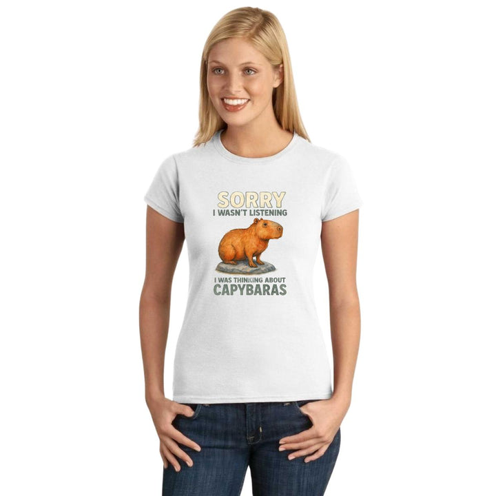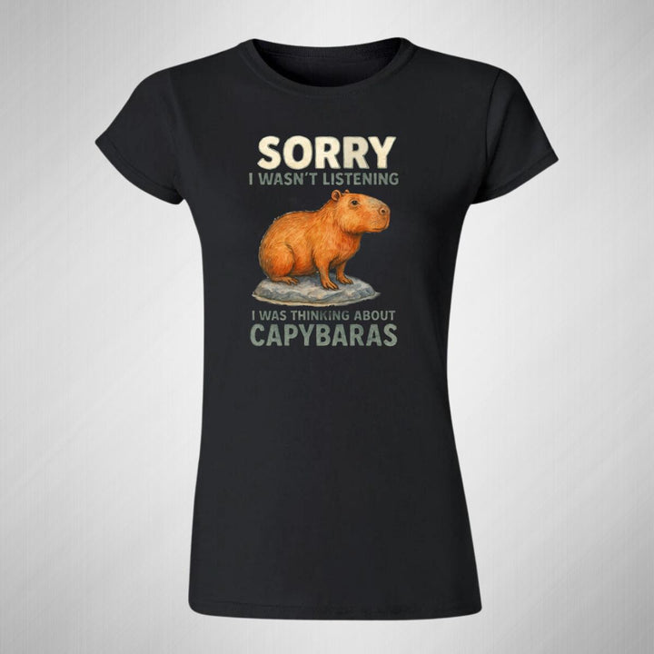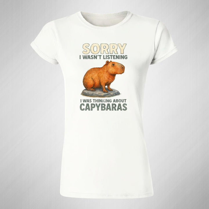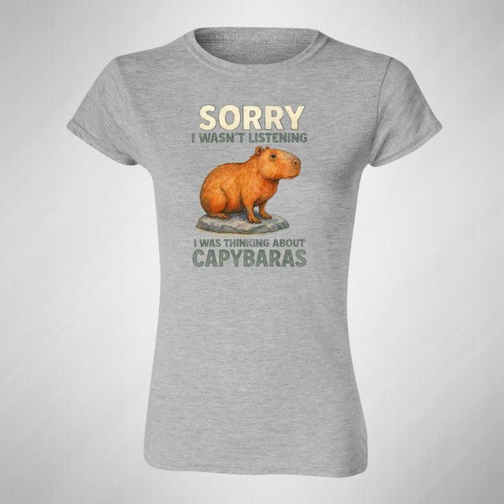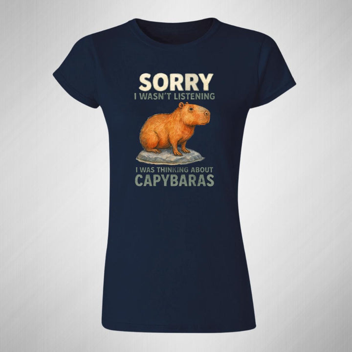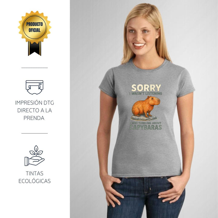 Playera de adulto manga corta, cuello redondo para mujer nueva, diseño Capibara Carpincho Frases original impreso con tecnología DTG (directo a la prenda) tacto cero, uso casual o deportiva, 100% algodón peinado, ajuste semi entallado con costuras laterales. Colores de camiseta para dama: Negro, Blanco, Azul Marino, Gris.