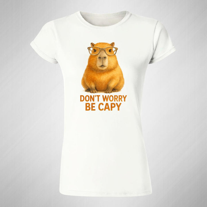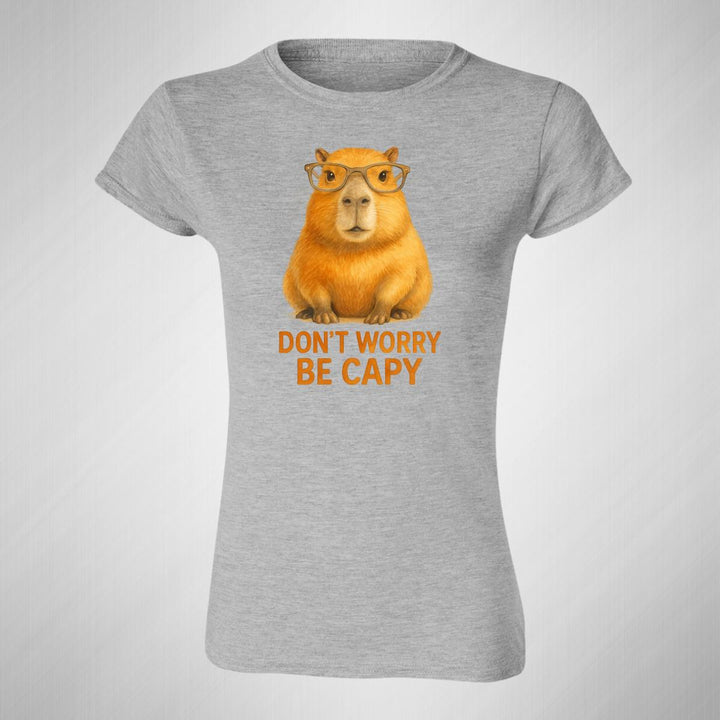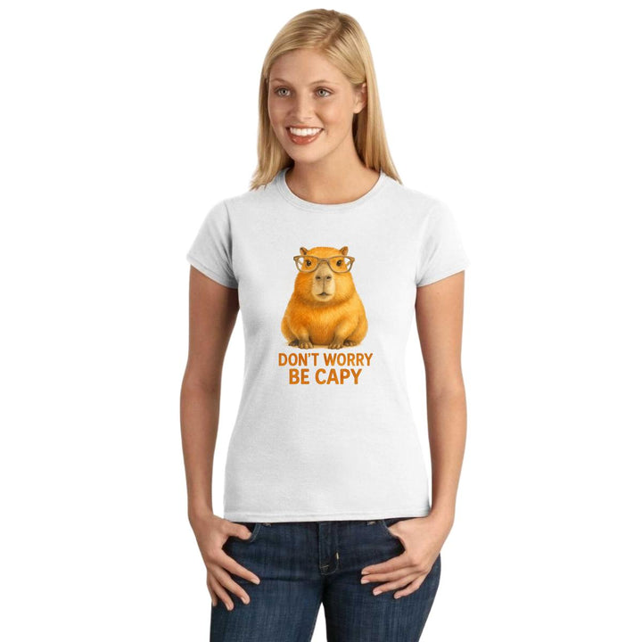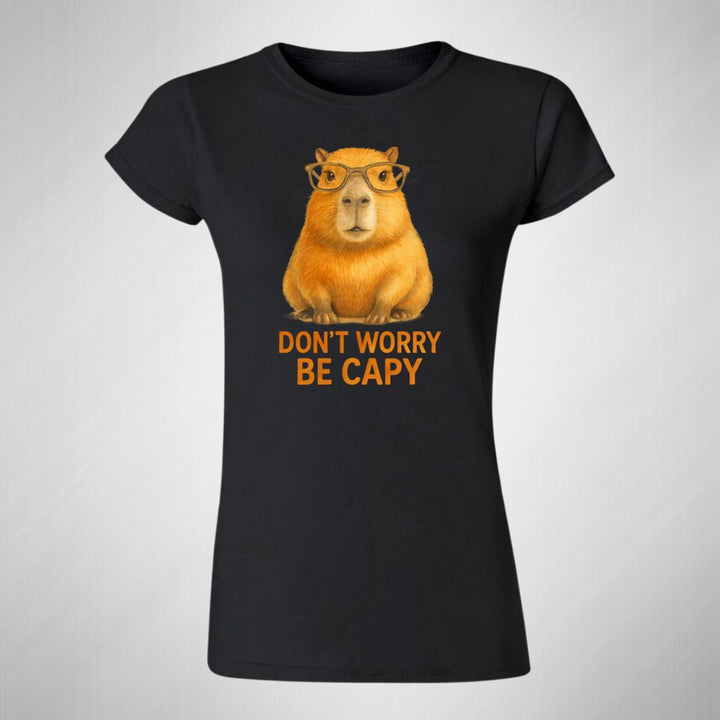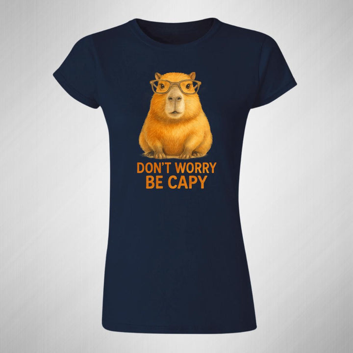 Playera de adulto manga corta, cuello redondo para mujer nueva, diseño Capibara Carpincho Frases original impreso con tecnología DTG (directo a la prenda) tacto cero, uso casual o deportiva, 100% algodón peinado, ajuste semi entallado con costuras laterales. Colores de camiseta para dama: Negro, Blanco, Azul Marino, Gris.