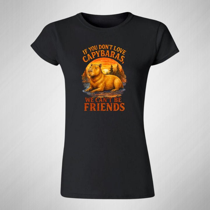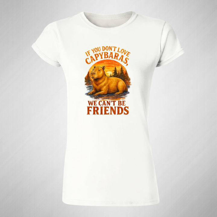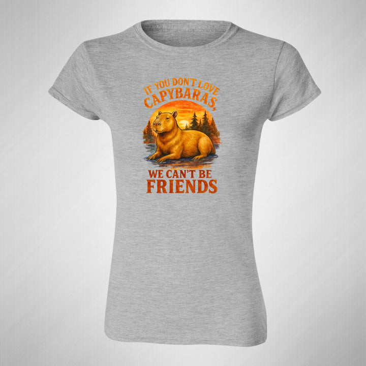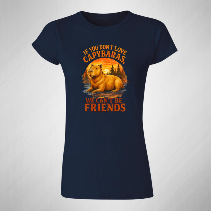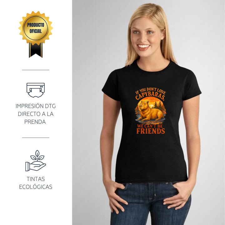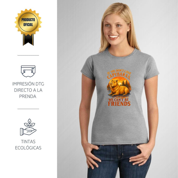 Playera de adulto manga corta, cuello redondo para mujer nueva, diseño Capibara Carpincho Frases original impreso con tecnología DTG (directo a la prenda) tacto cero, uso casual o deportiva, 100% algodón peinado, ajuste semi entallado con costuras laterales. Colores de camiseta para dama: Negro, Blanco, Azul Marino, Gris.