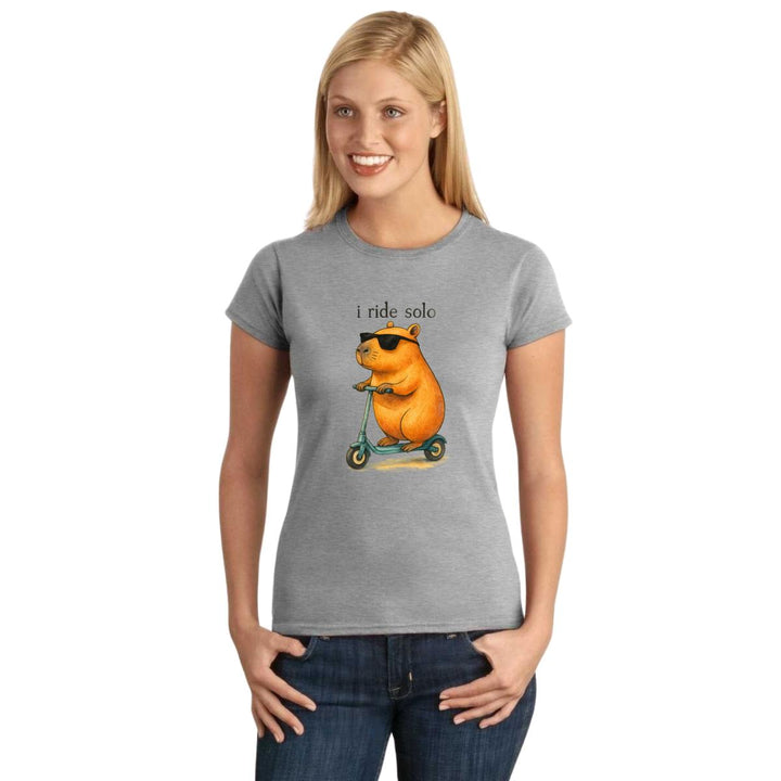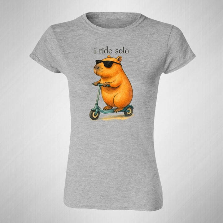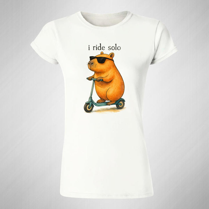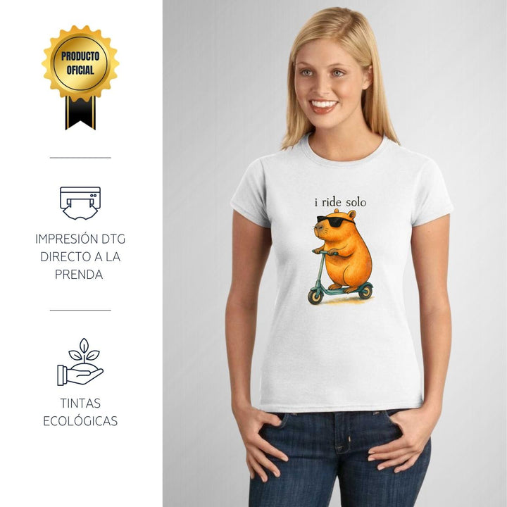 Playera de adulto manga corta, cuello redondo para mujer nueva, diseño Capibara Carpincho Frases original impreso con tecnología DTG (directo a la prenda) tacto cero, uso casual o deportiva, 100% algodón peinado, ajuste semi entallado con costuras laterales. Colores de camiseta para dama: Blanco, Gris.