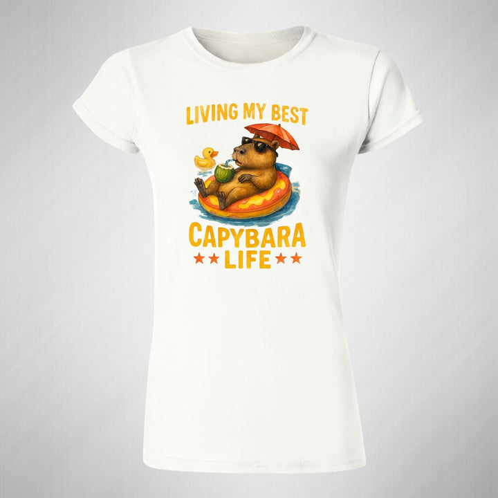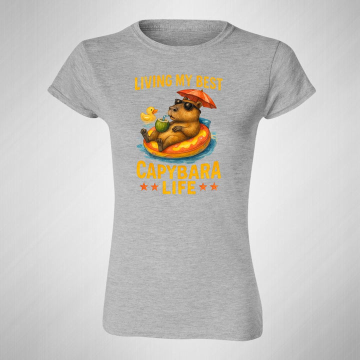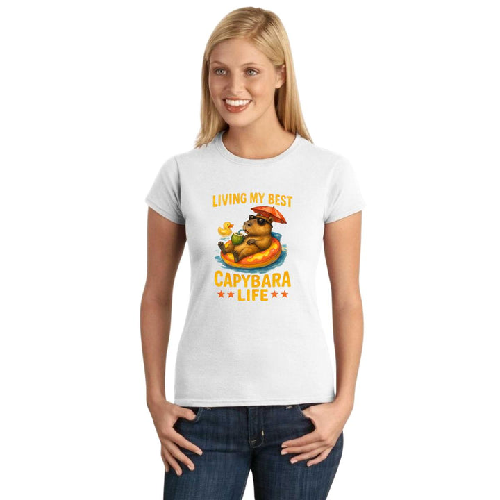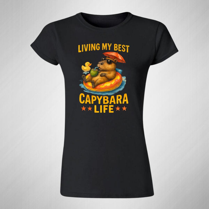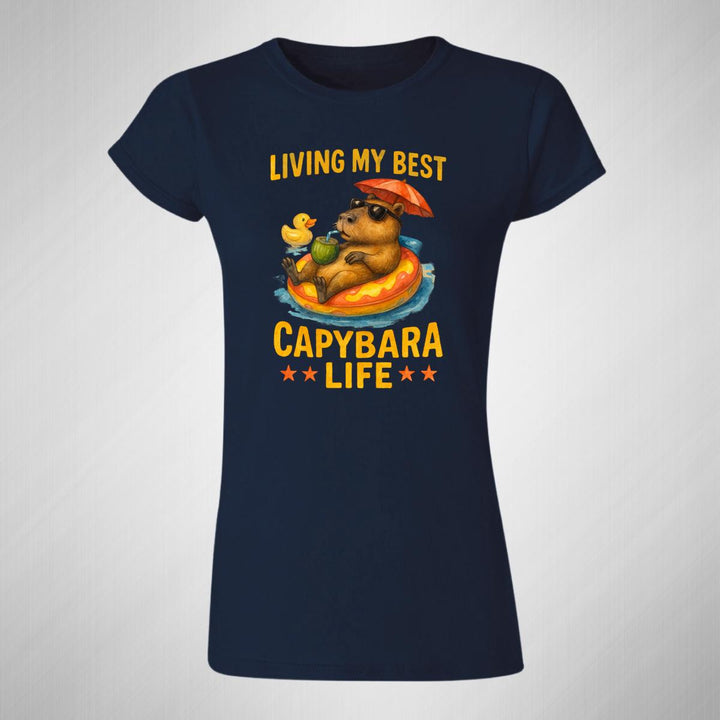 Playera de adulto manga corta, cuello redondo para mujer nueva, diseño Capibara Carpincho Frases original impreso con tecnología DTG (directo a la prenda) tacto cero, uso casual o deportiva, 100% algodón peinado, ajuste semi entallado con costuras laterales. Colores de camiseta para dama: Negro, Blanco, Azul Marino, Gris.