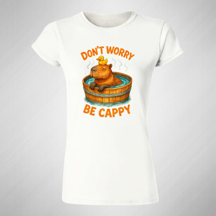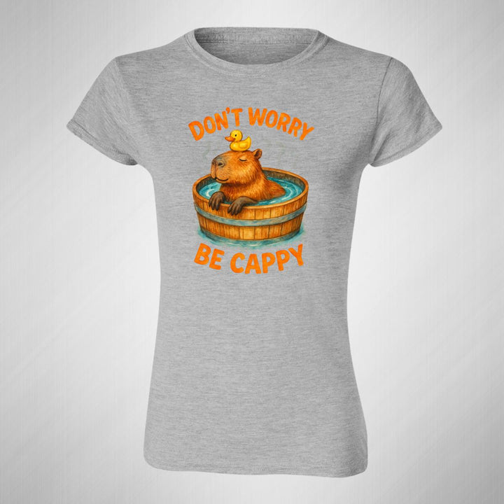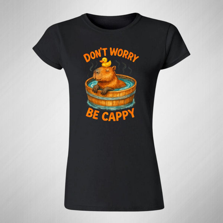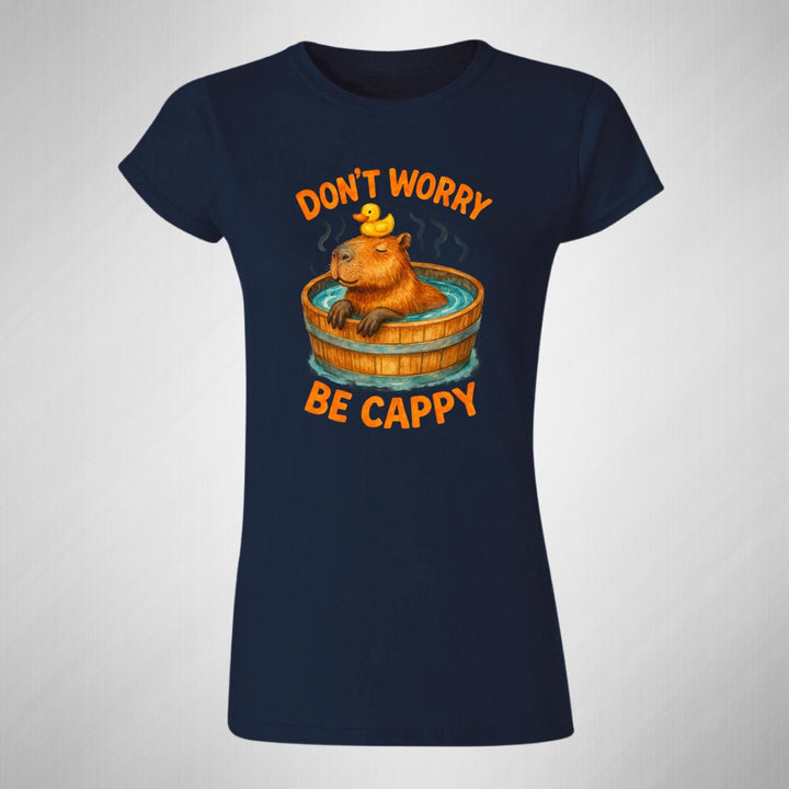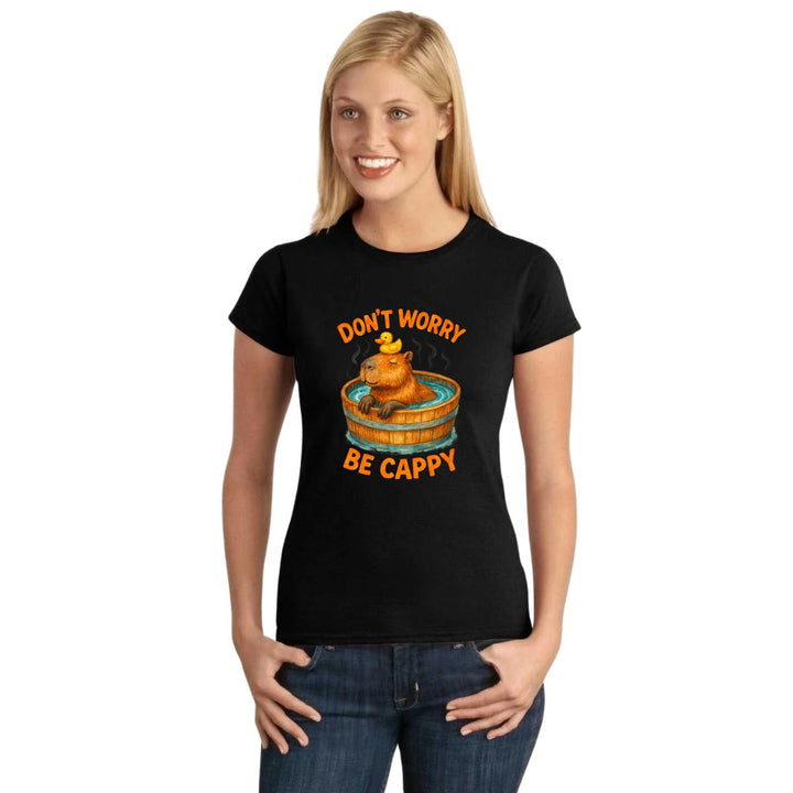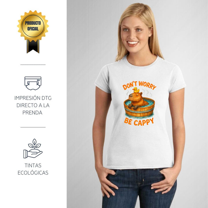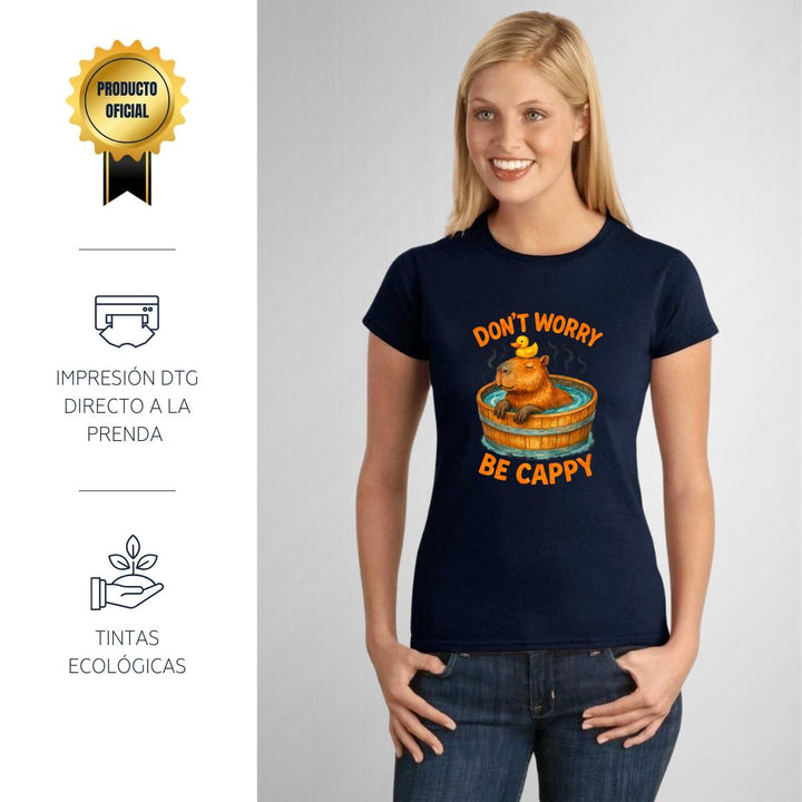 Playera de adulto manga corta, cuello redondo para mujer nueva, diseño Capibara Carpincho Frases original impreso con tecnología DTG (directo a la prenda) tacto cero, uso casual o deportiva, 100% algodón peinado, ajuste semi entallado con costuras laterales. Colores de camiseta para dama: Negro, Blanco, Azul Marino, Gris.