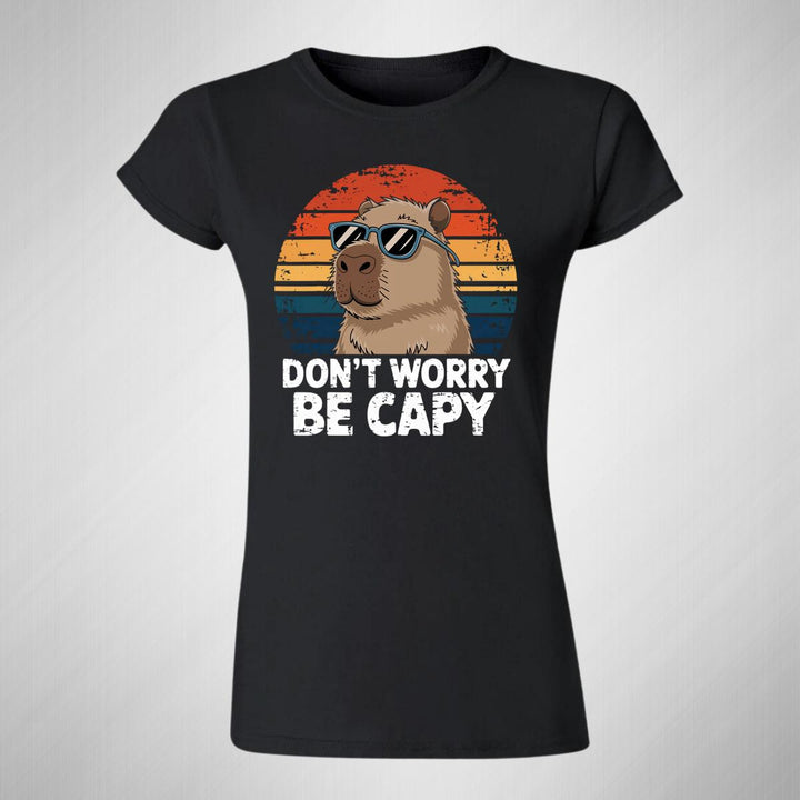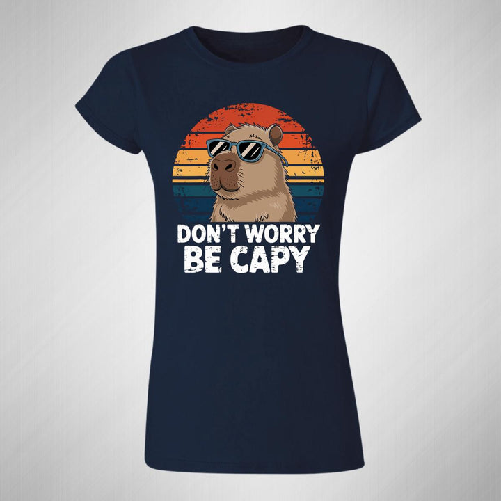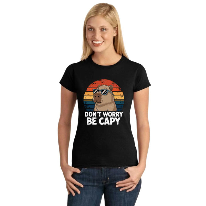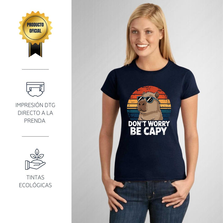 Playera de adulto manga corta, cuello redondo para mujer nueva, diseño Capibara Carpincho Frases original impreso con tecnología DTG (directo a la prenda) tacto cero, uso casual o deportiva, 100% algodón peinado, ajuste semi entallado con costuras laterales. Colores de camiseta para dama: Negro, Azul Marino.