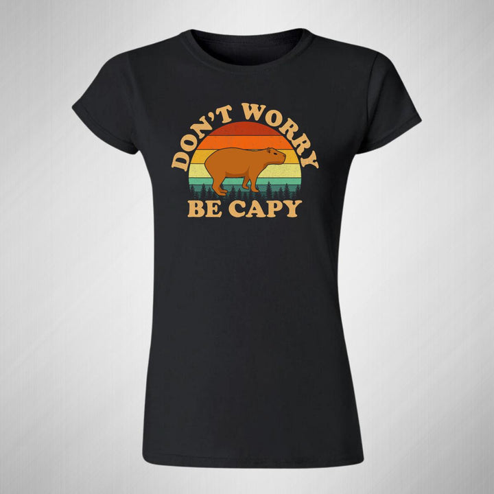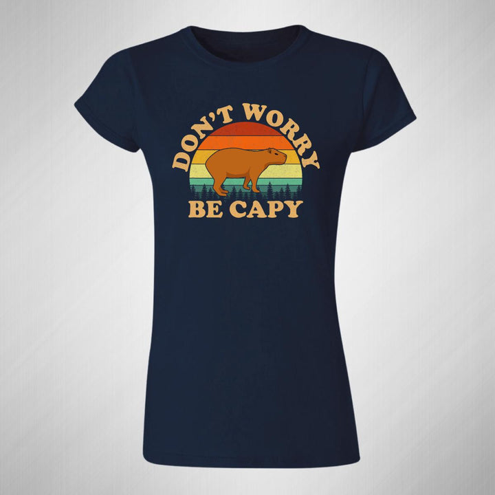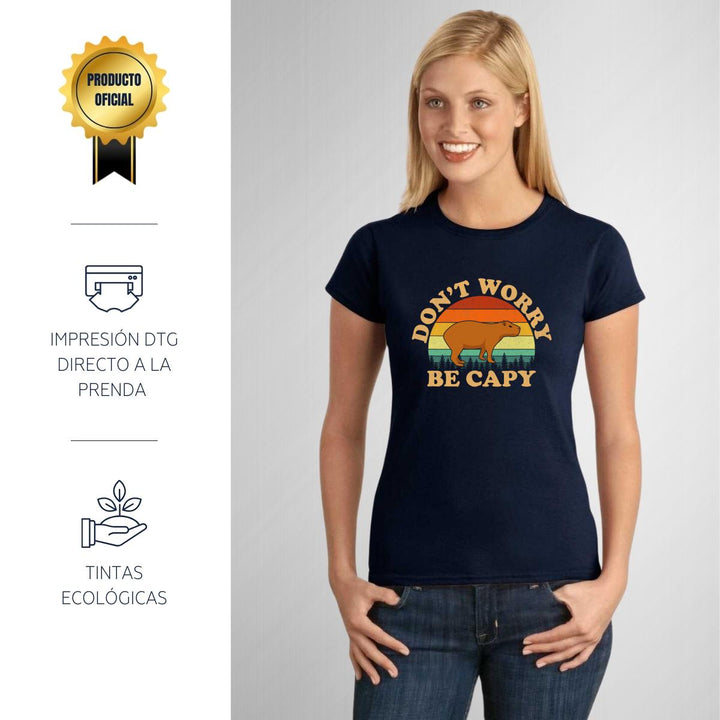 Playera de adulto manga corta, cuello redondo para mujer nueva, diseño Capibara Carpincho Frases original impreso con tecnología DTG (directo a la prenda) tacto cero, uso casual o deportiva, 100% algodón peinado, ajuste semi entallado con costuras laterales. Colores de camiseta para dama: Negro, Azul Marino.