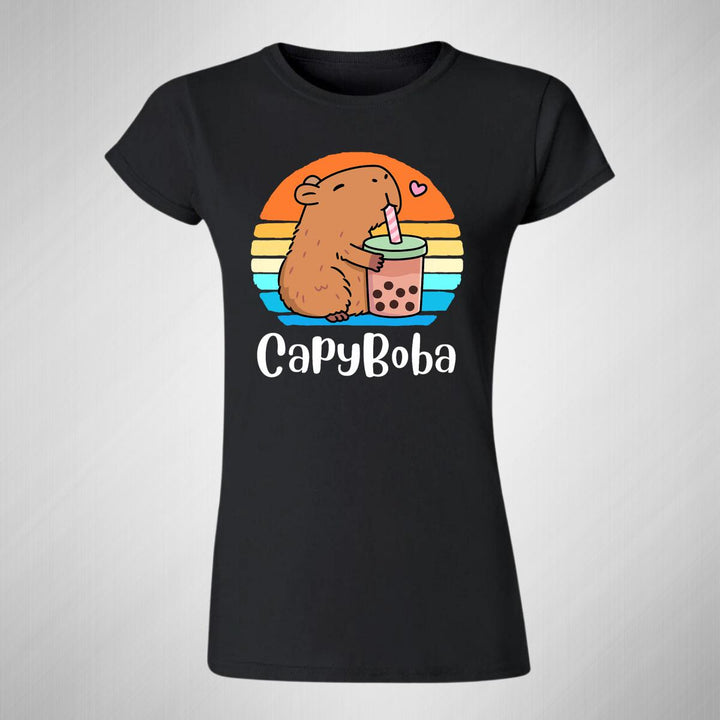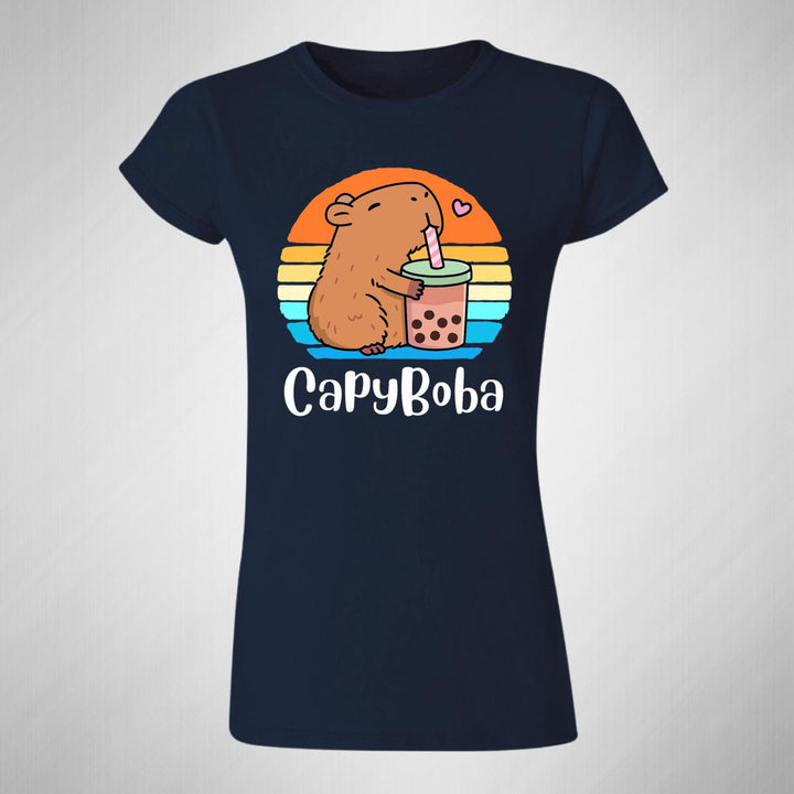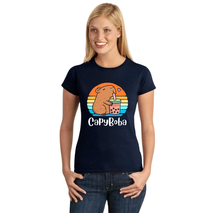 Playera de adulto manga corta, cuello redondo para mujer nueva, diseño Capibara Carpincho Frases original impreso con tecnología DTG (directo a la prenda) tacto cero, uso casual o deportiva, 100% algodón peinado, ajuste semi entallado con costuras laterales. Colores de camiseta para dama: Negro, Azul Marino.