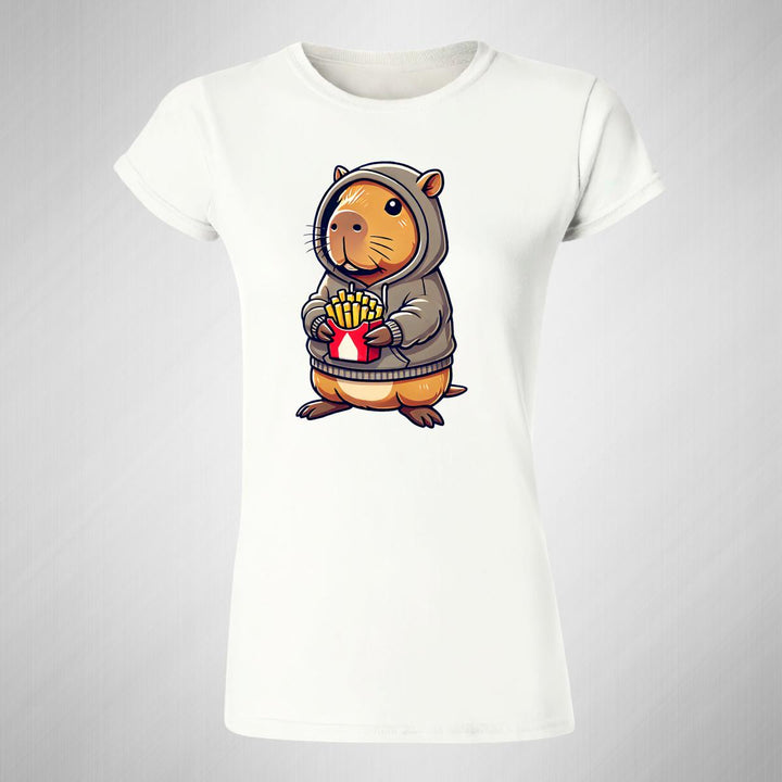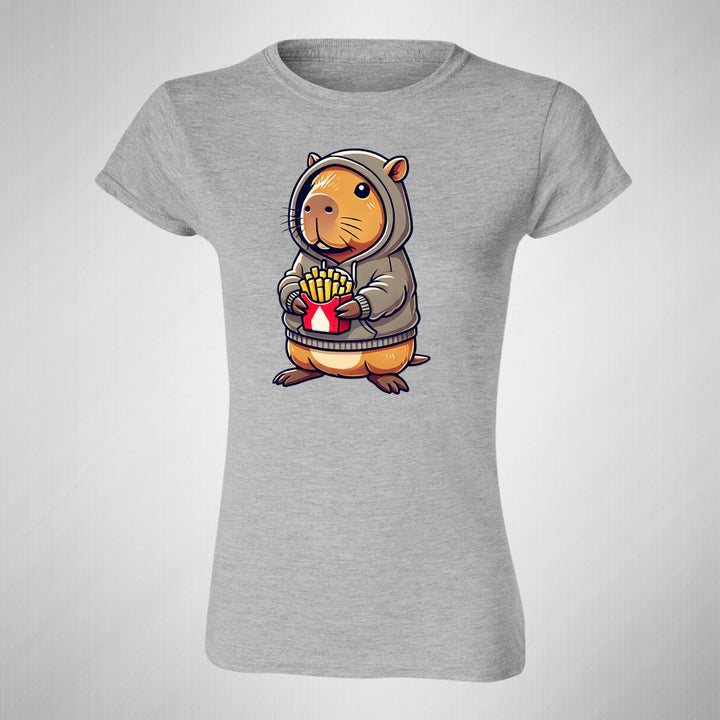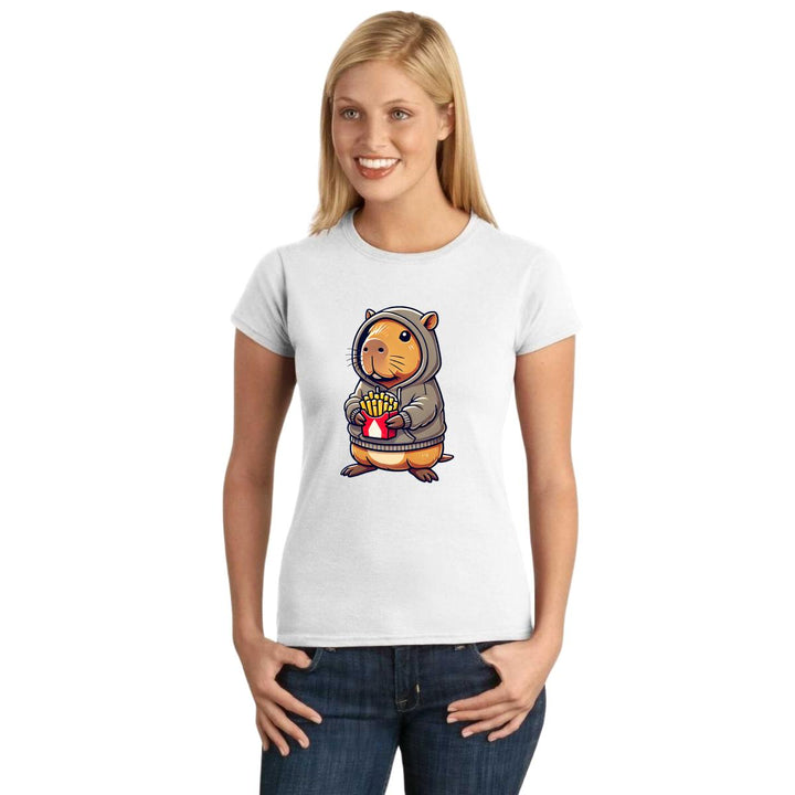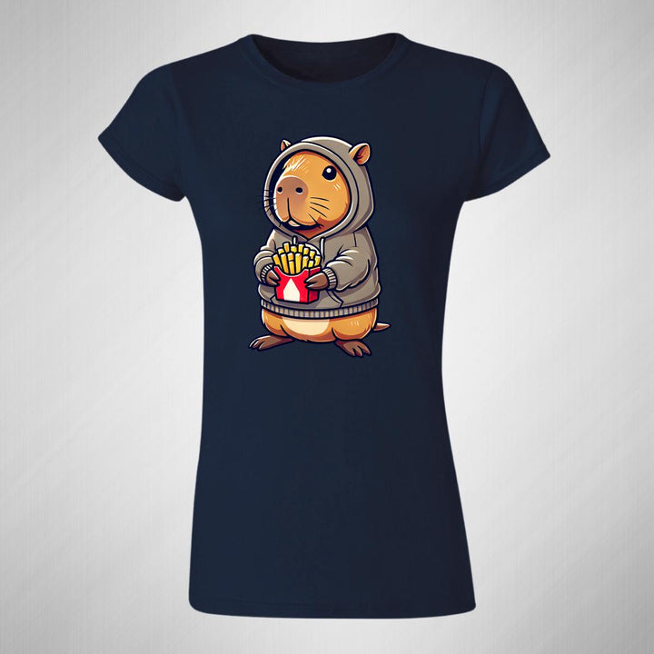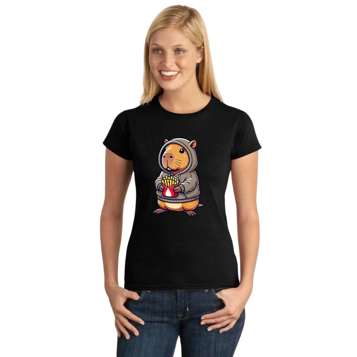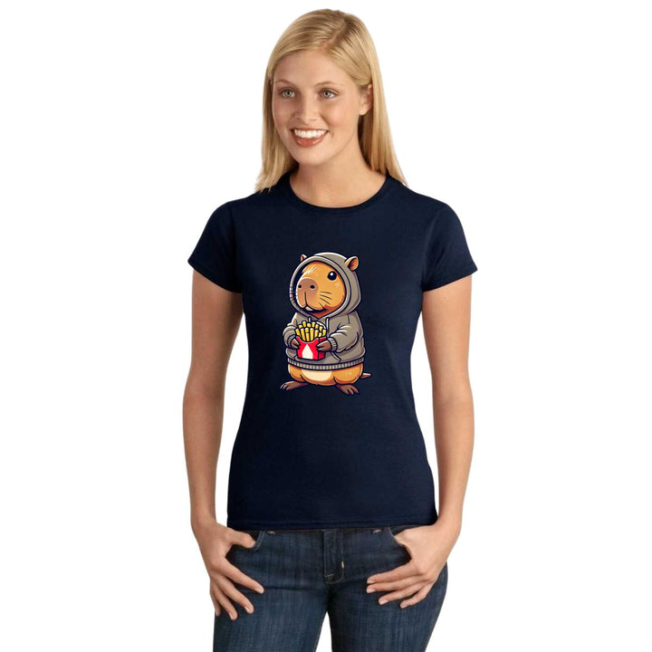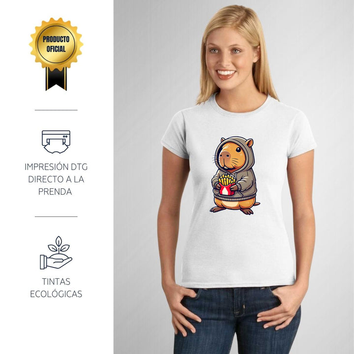 Playera de adulto manga corta, cuello redondo para mujer nueva, diseño Capibara Carpincho Frases original impreso con tecnología DTG (directo a la prenda) tacto cero, uso casual o deportiva, 100% algodón peinado, ajuste semi entallado con costuras laterales. Colores de camiseta para dama: Negro, Blanco, Azul Marino, Gris.