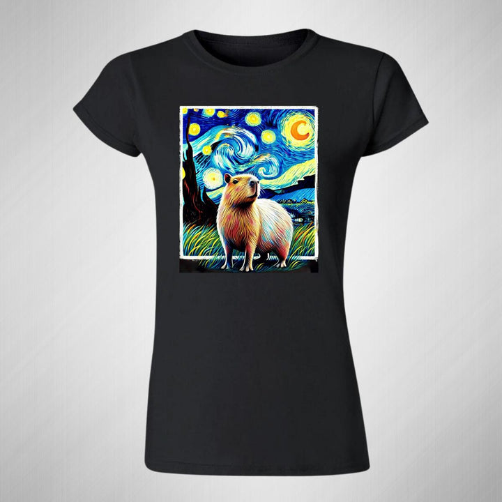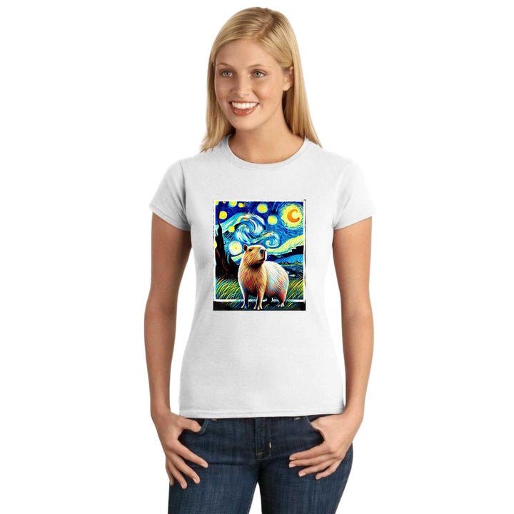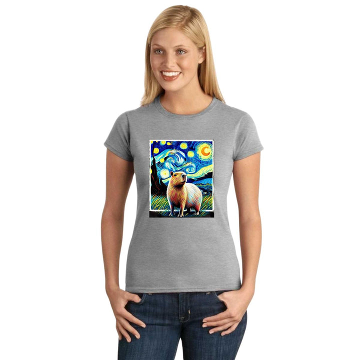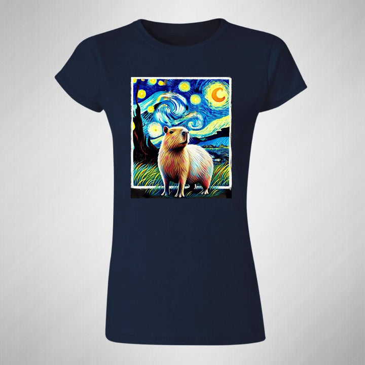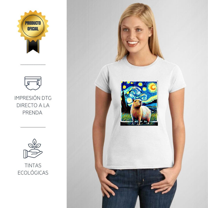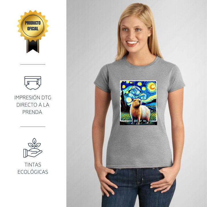 Playera de adulto manga corta, cuello redondo para mujer nueva, diseño Capibara Carpincho Frases original impreso con tecnología DTG (directo a la prenda) tacto cero, uso casual o deportiva, 100% algodón peinado, ajuste semi entallado con costuras laterales. Colores de camiseta para dama: Negro, Blanco, Azul Marino, Gris.