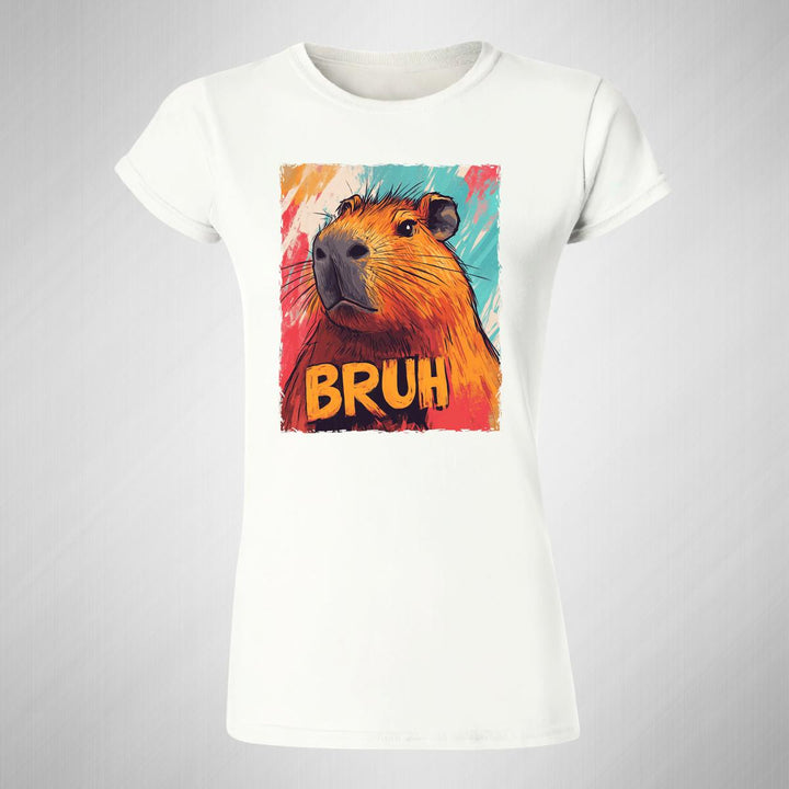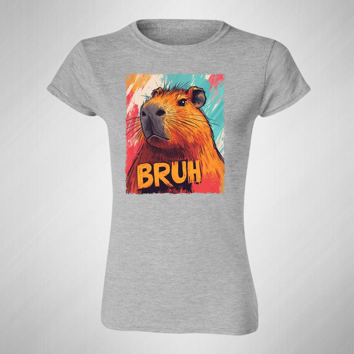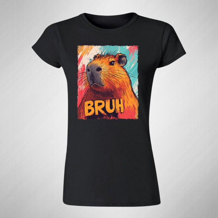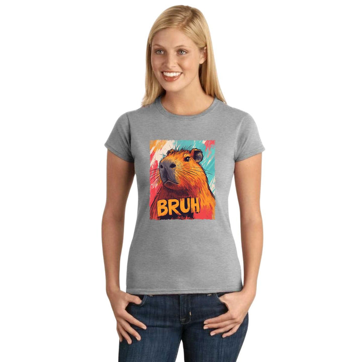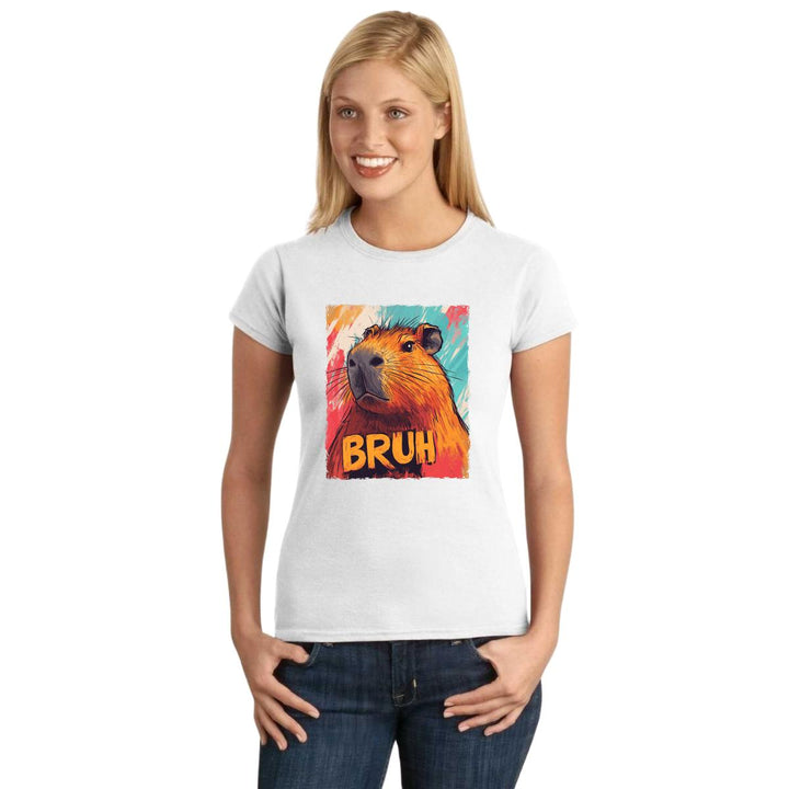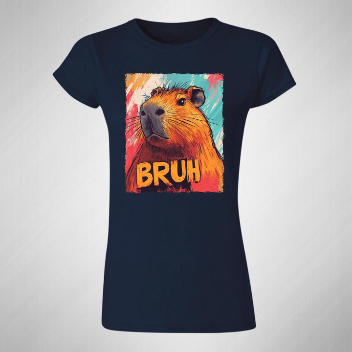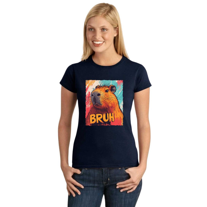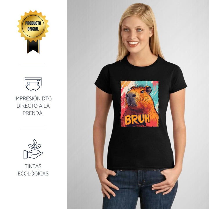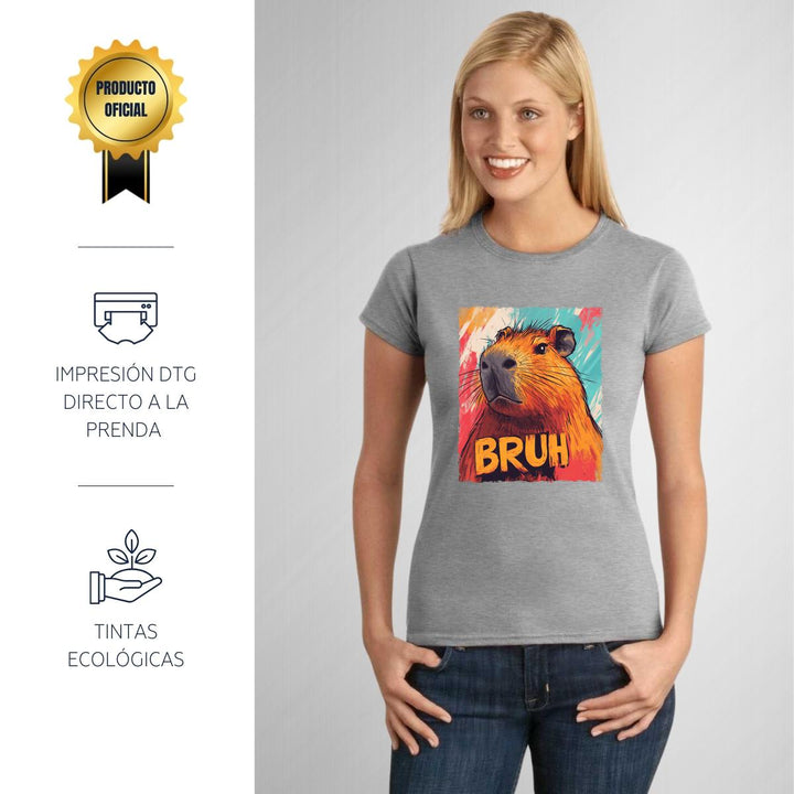 Playera de adulto manga corta, cuello redondo para mujer nueva, diseño Capibara Carpincho Frases original impreso con tecnología DTG (directo a la prenda) tacto cero, uso casual o deportiva, 100% algodón peinado, ajuste semi entallado con costuras laterales. Colores de camiseta para dama: Negro, Blanco, Azul Marino, Gris.