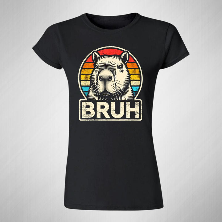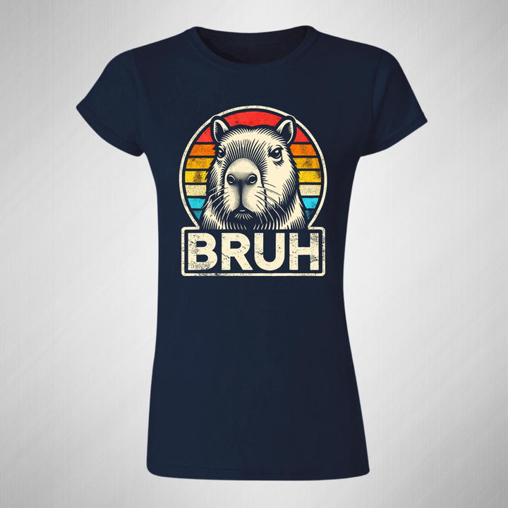 Playera de adulto manga corta, cuello redondo para mujer nueva, diseño Capibara Carpincho Frases original impreso con tecnología DTG (directo a la prenda) tacto cero, uso casual o deportiva, 100% algodón peinado, ajuste semi entallado con costuras laterales. Colores de camiseta para dama: Negro, Azul Marino.