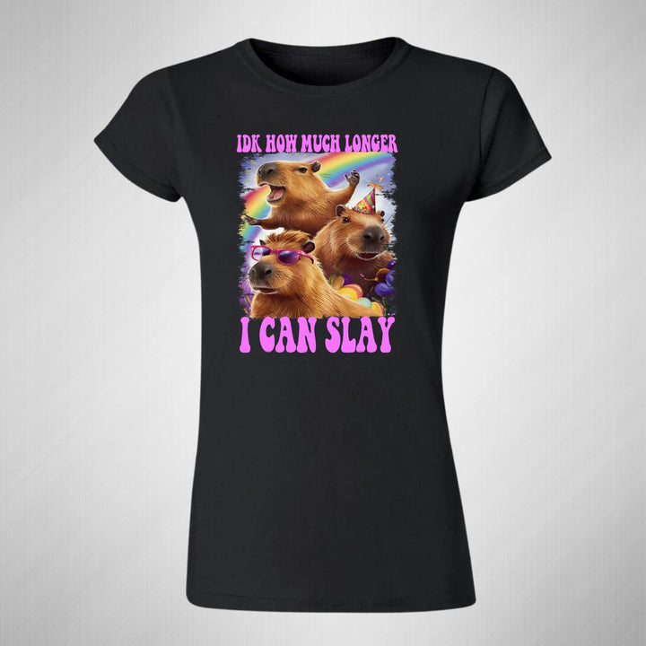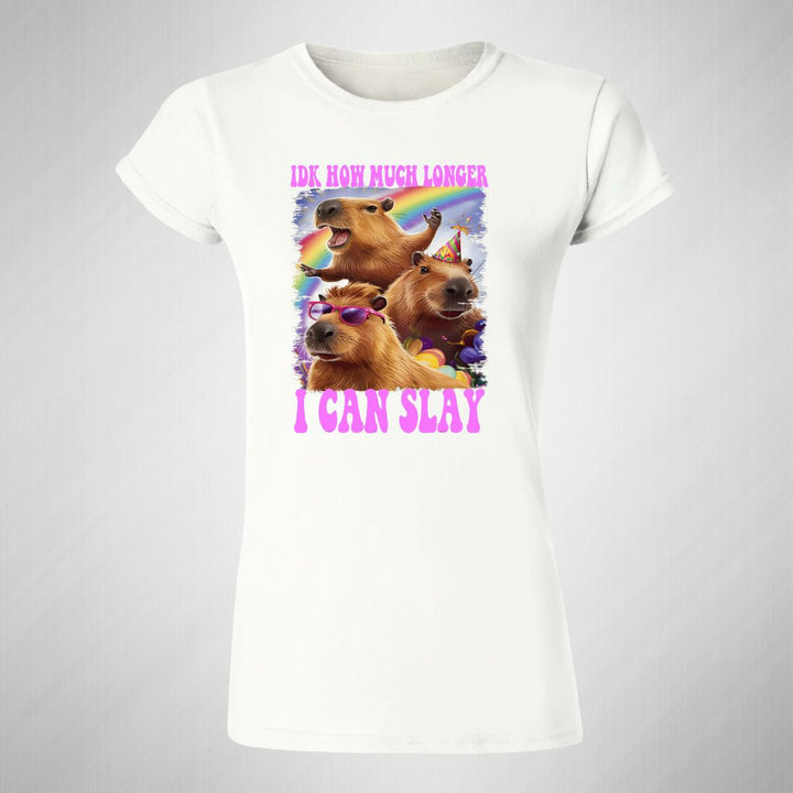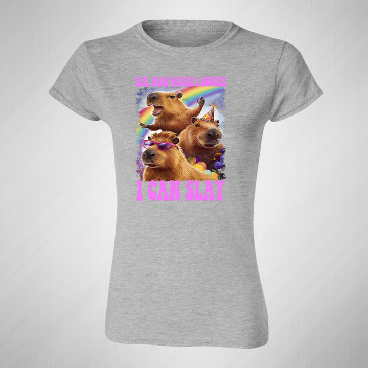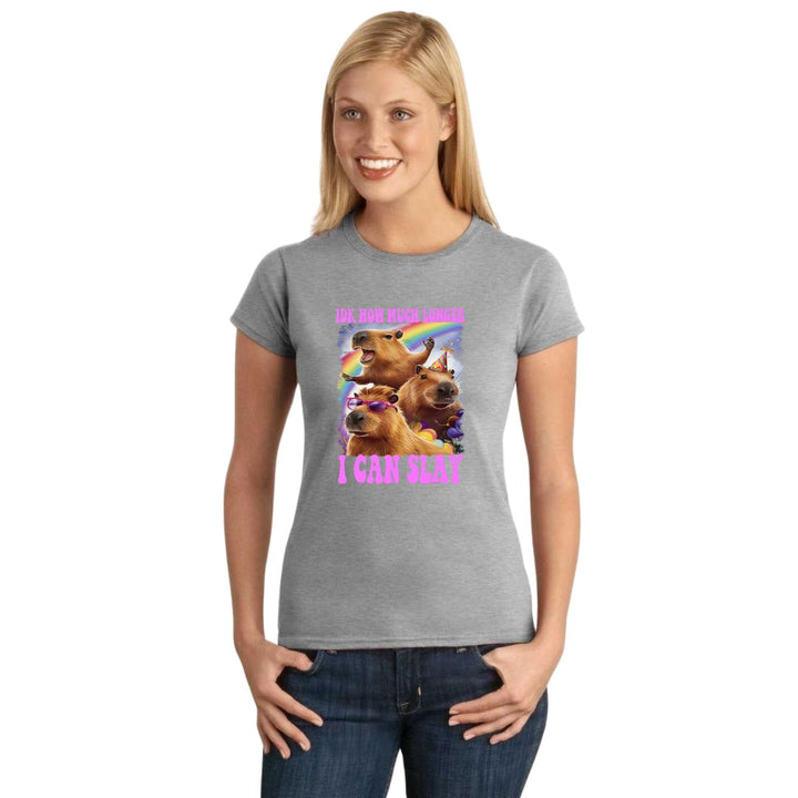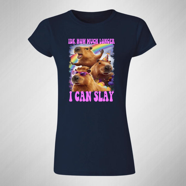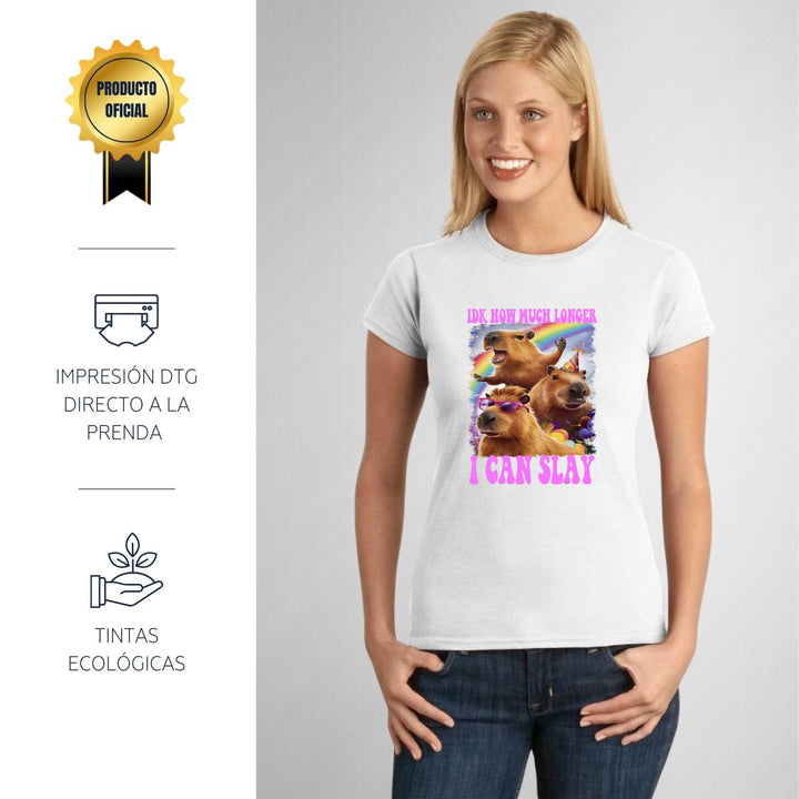 Playera de adulto manga corta, cuello redondo para mujer nueva, diseño Capibara Carpincho Frases original impreso con tecnología DTG (directo a la prenda) tacto cero, uso casual o deportiva, 100% algodón peinado, ajuste semi entallado con costuras laterales. Colores de camiseta para dama: Negro, Blanco, Azul Marino, Gris.