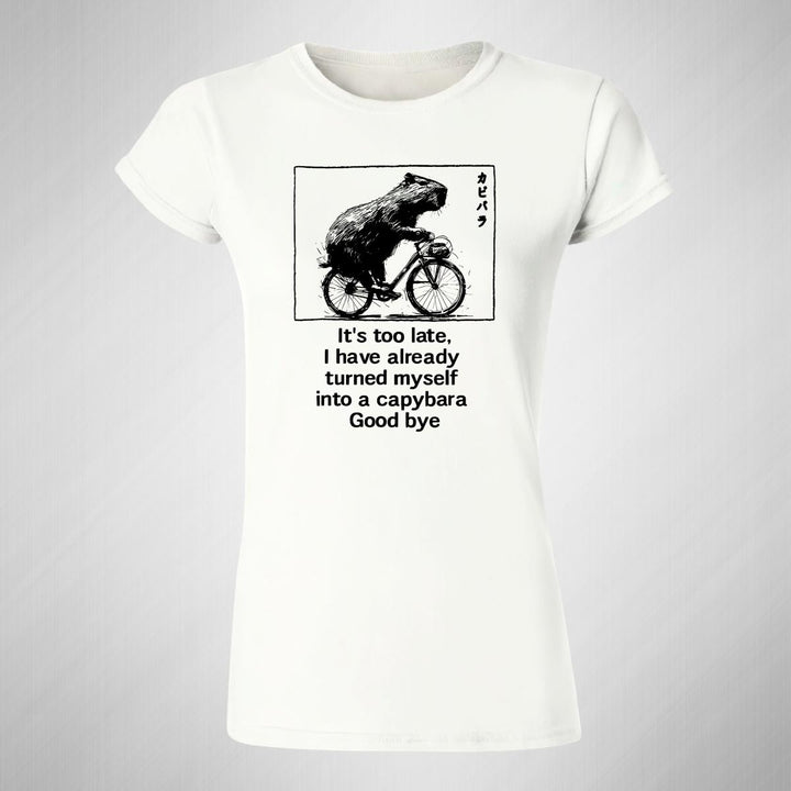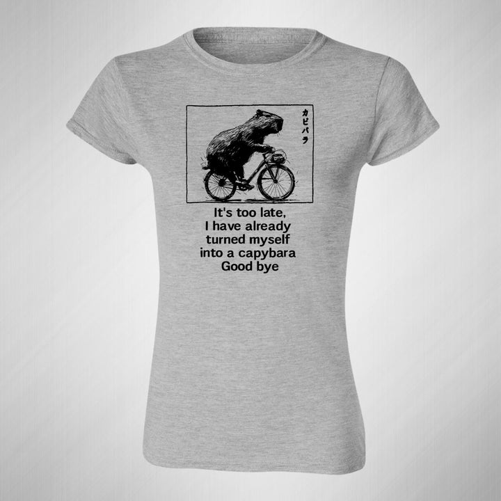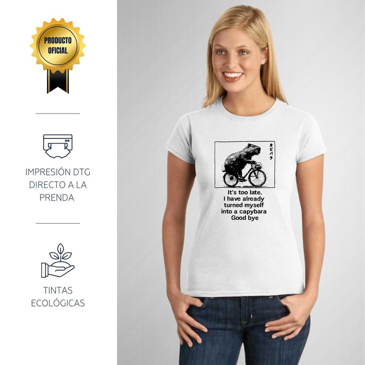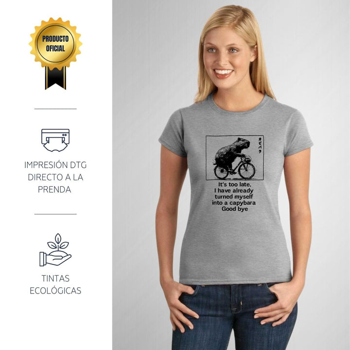 Playera de adulto manga corta, cuello redondo para mujer nueva, diseño Capibara Carpincho Frases original impreso con tecnología DTG (directo a la prenda) tacto cero, uso casual o deportiva, 100% algodón peinado, ajuste semi entallado con costuras laterales. Colores de camiseta para dama: Blanco, Gris.