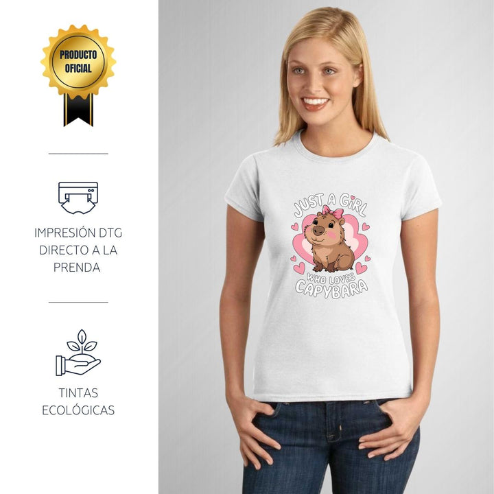 Playera de adulto manga corta, cuello redondo para mujer nueva, diseño Capibara Carpincho Frases original impreso con tecnología DTG (directo a la prenda) tacto cero, uso casual o deportiva, 100% algodón peinado, ajuste semi entallado con costuras laterales. Colores de camiseta para dama: Negro, Blanco, Azul Marino, Gris.