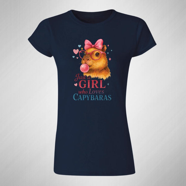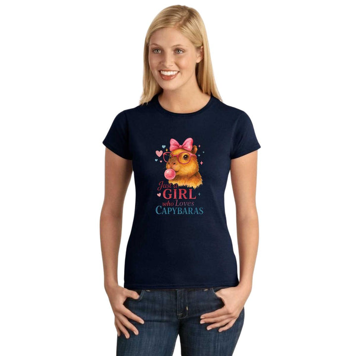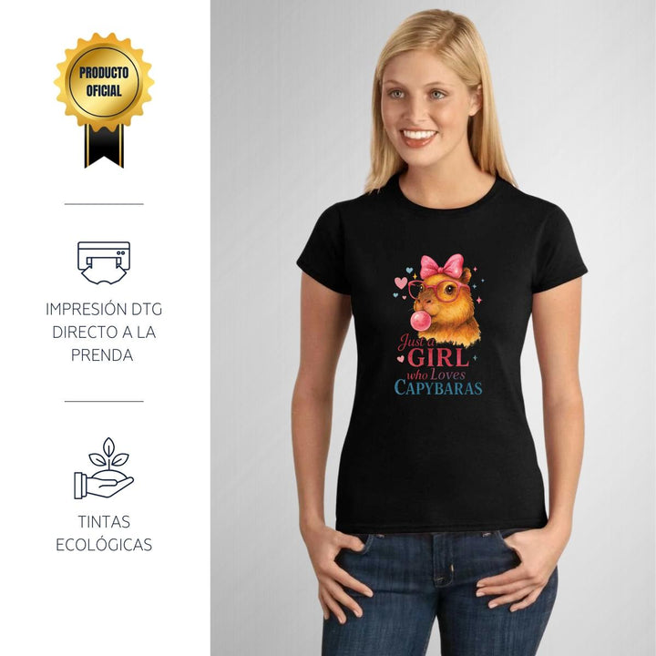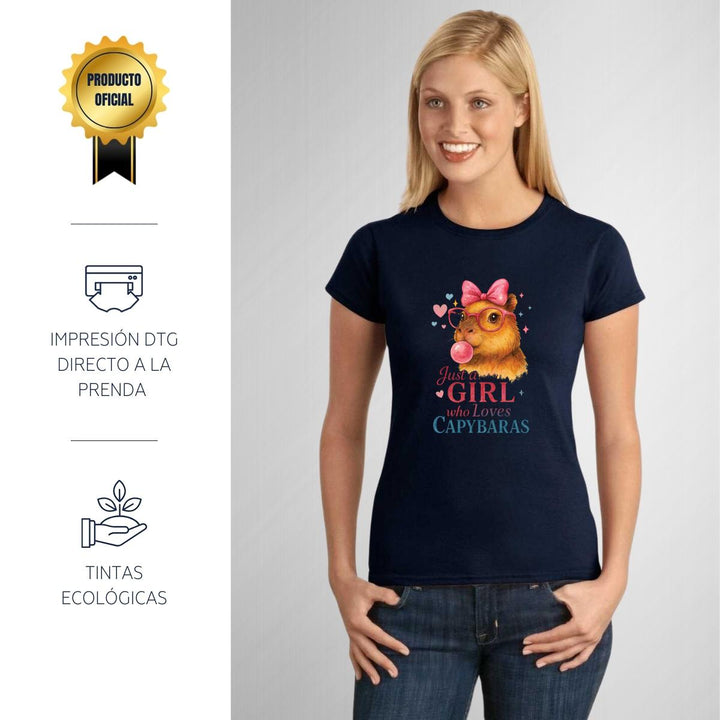 Playera de adulto manga corta, cuello redondo para mujer nueva, diseño Capibara Carpincho Frases original impreso con tecnología DTG (directo a la prenda) tacto cero, uso casual o deportiva, 100% algodón peinado, ajuste semi entallado con costuras laterales. Colores de camiseta para dama: Negro, Blanco, Azul Marino, Gris.