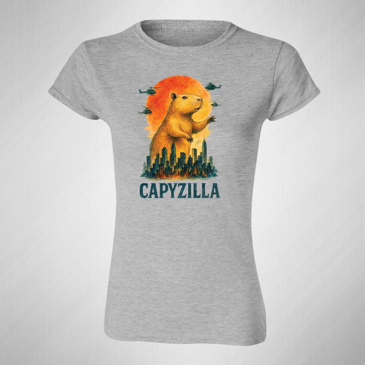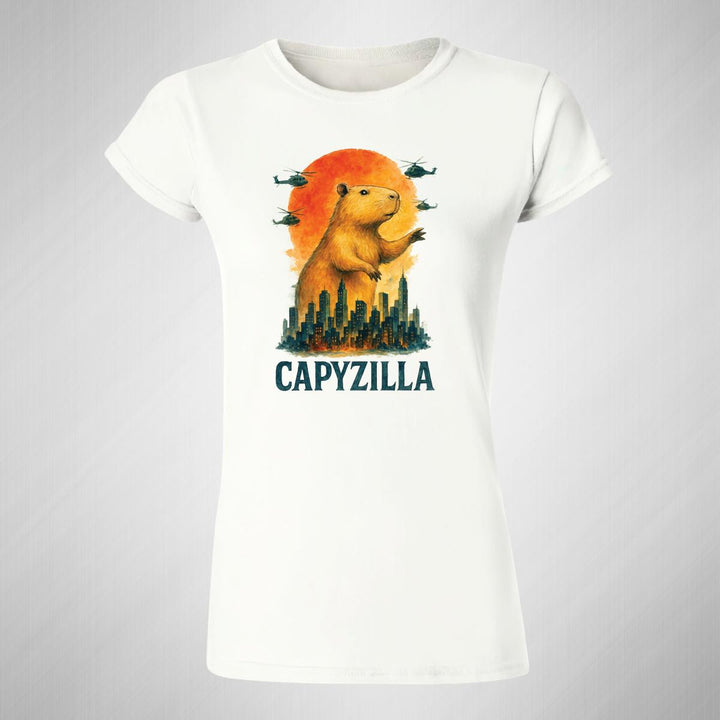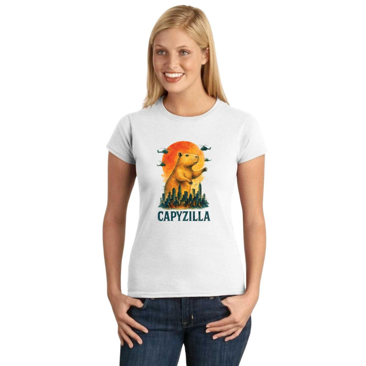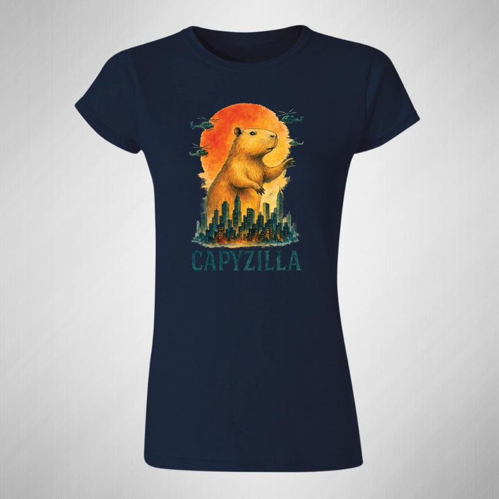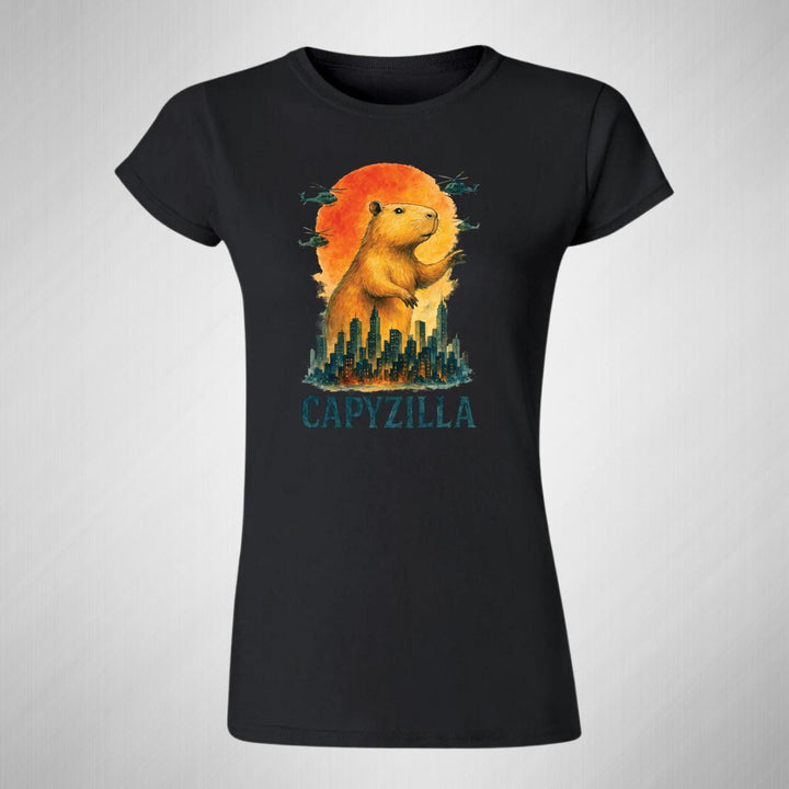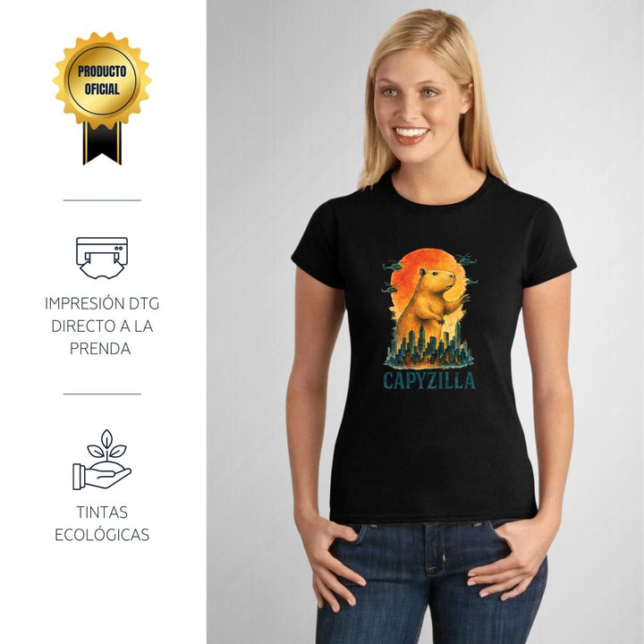 Playera de adulto manga corta, cuello redondo para mujer nueva, diseño Capibara Carpincho Frases original impreso con tecnología DTG (directo a la prenda) tacto cero, uso casual o deportiva, 100% algodón peinado, ajuste semi entallado con costuras laterales. Colores de camiseta para dama: Negro, Blanco, Azul Marino, Gris.