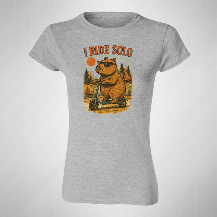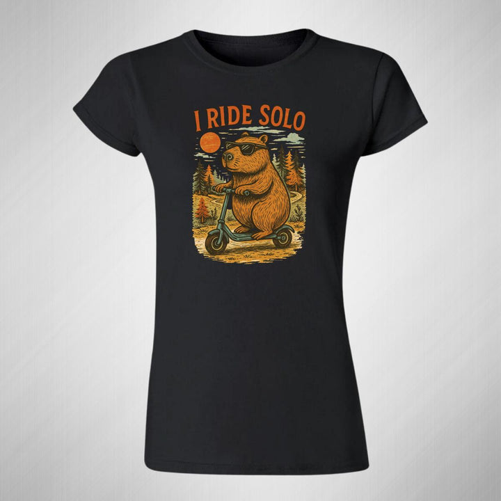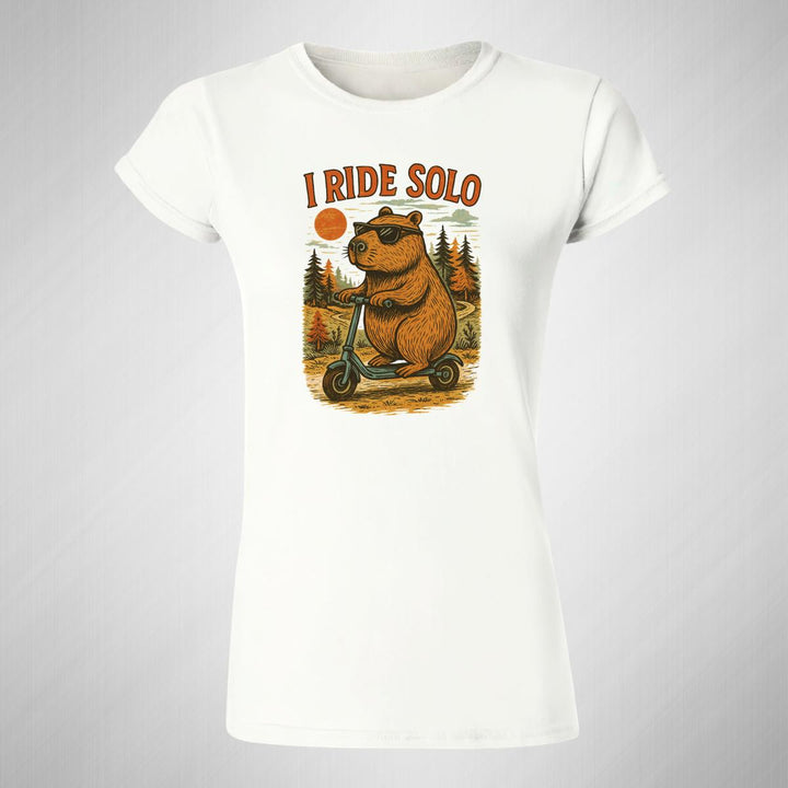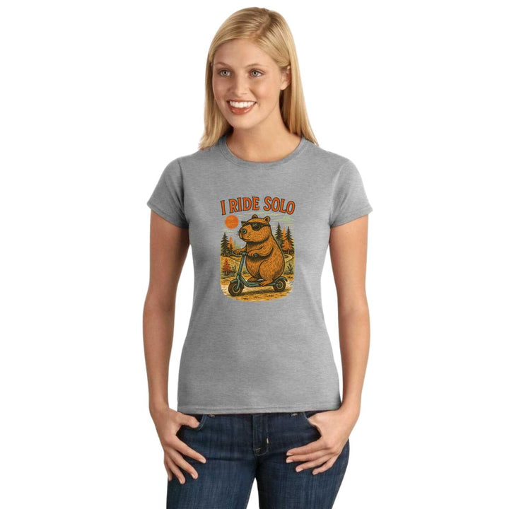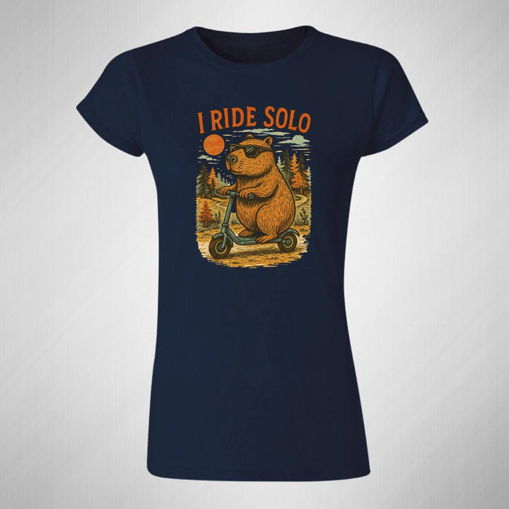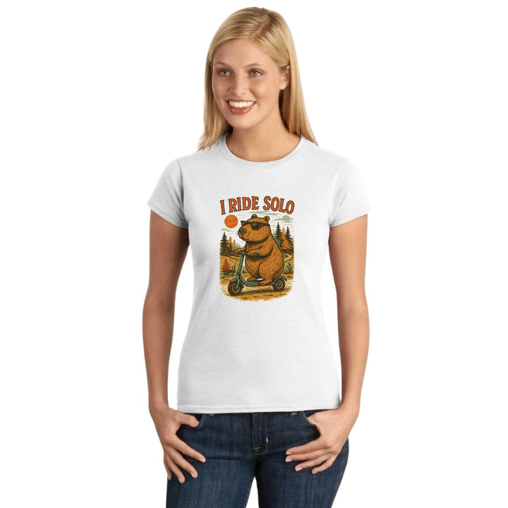 Playera de adulto manga corta, cuello redondo para mujer nueva, diseño Capibara Carpincho Frases original impreso con tecnología DTG (directo a la prenda) tacto cero, uso casual o deportiva, 100% algodón peinado, ajuste semi entallado con costuras laterales. Colores de camiseta para dama: Negro, Blanco, Azul Marino, Gris.