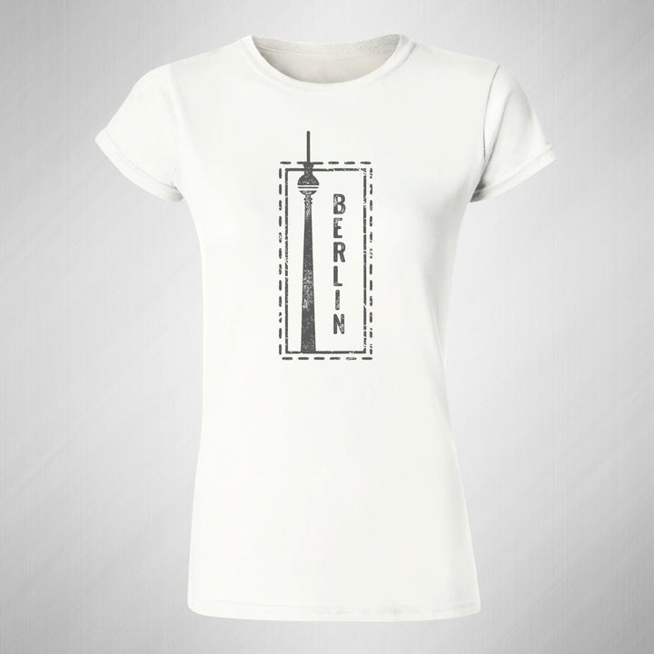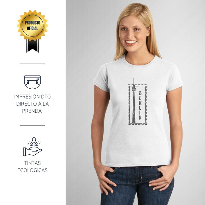 Playera de adulto manga corta, cuello redondo para mujer nueva, diseño Ciudad Berlín Alemania original impreso con tecnología DTG (directo a la prenda) tacto cero, uso casual o deportiva, 100% algodón peinado, ajuste semi entallado con costuras laterales. Colores de camiseta para dama: Blanco.